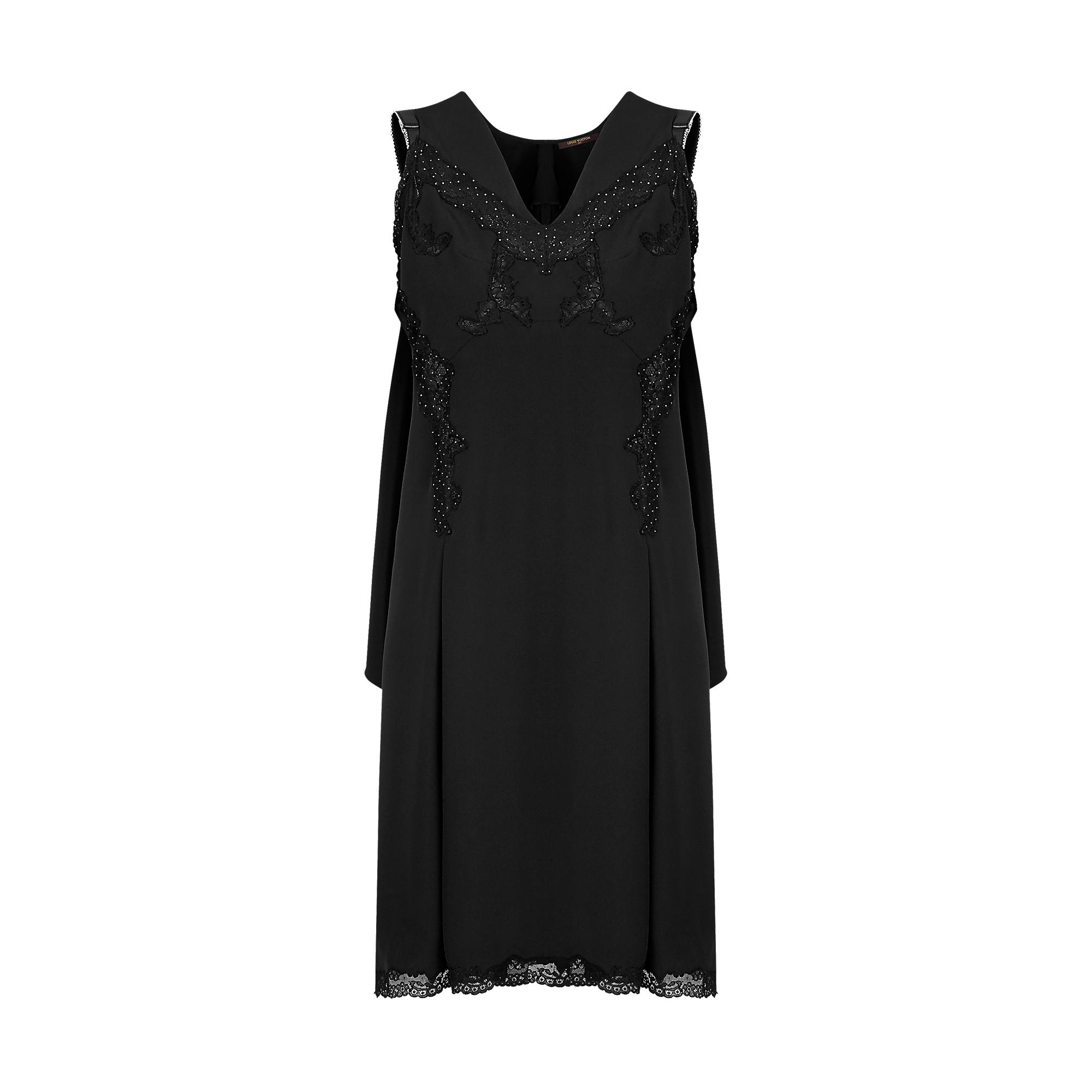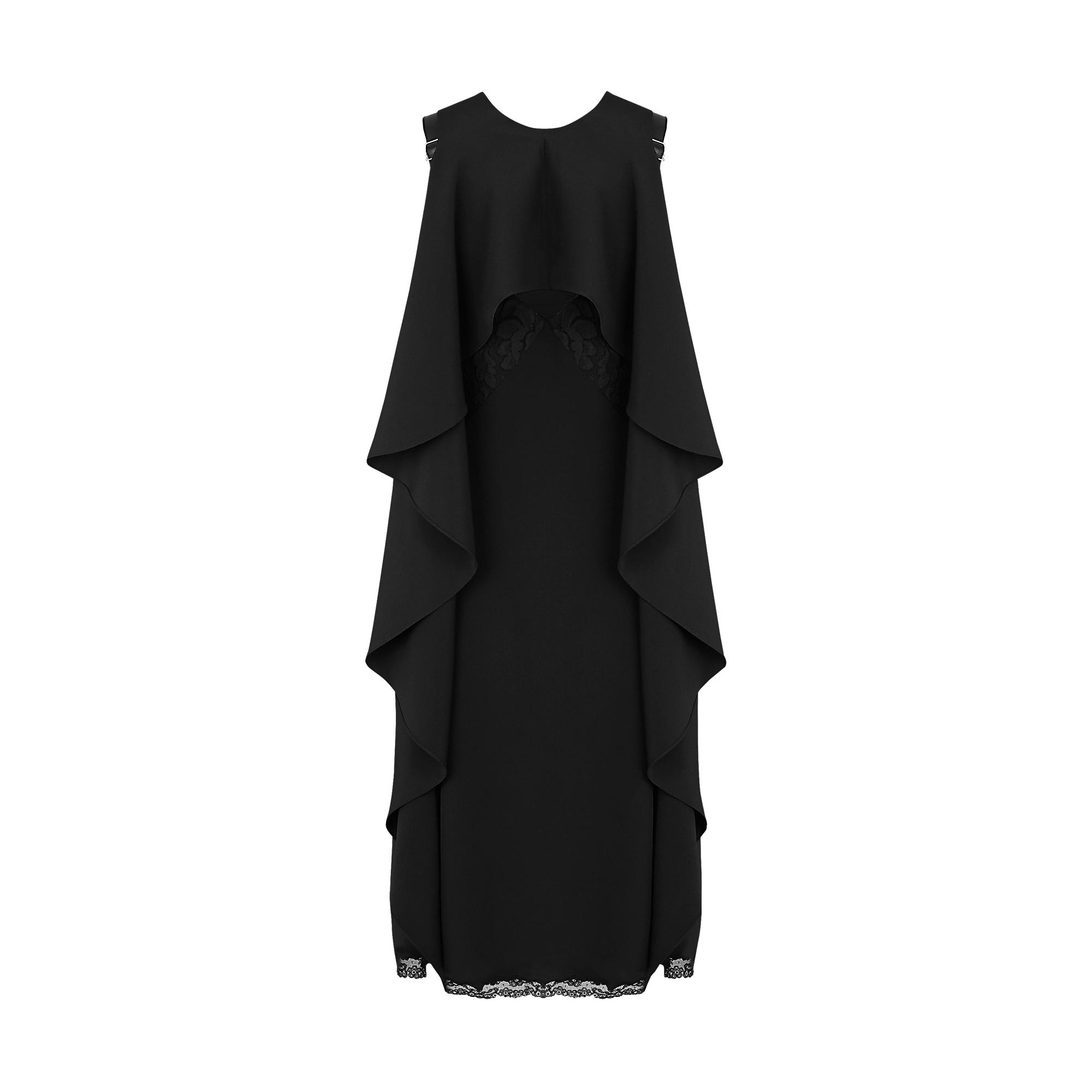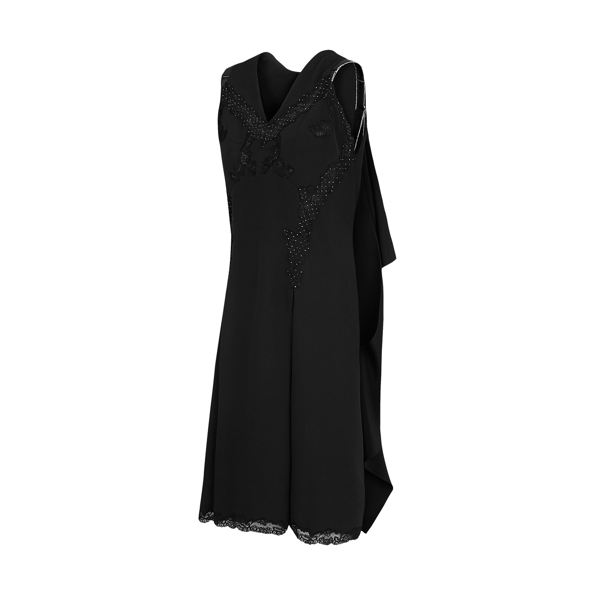 Crafted in light silk crepe marocain, this beautiful sleeveless cocktail dress can be worn in all seasons. Offering a play on transparency, it is adorned with embroidered lace inserts and leather straps.