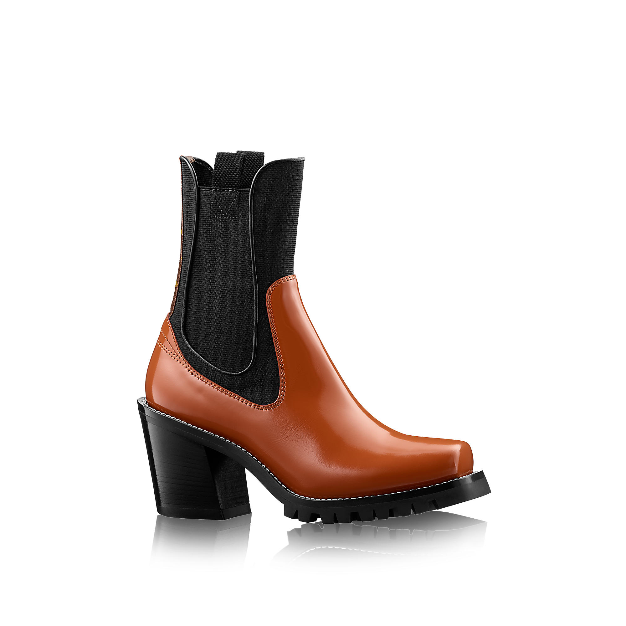 This chunky-heeled ankle boot with coloured elastic inserts combines elements from both Chelsea boots and biker boots into a cutting-edge yet easy-to-wear design.