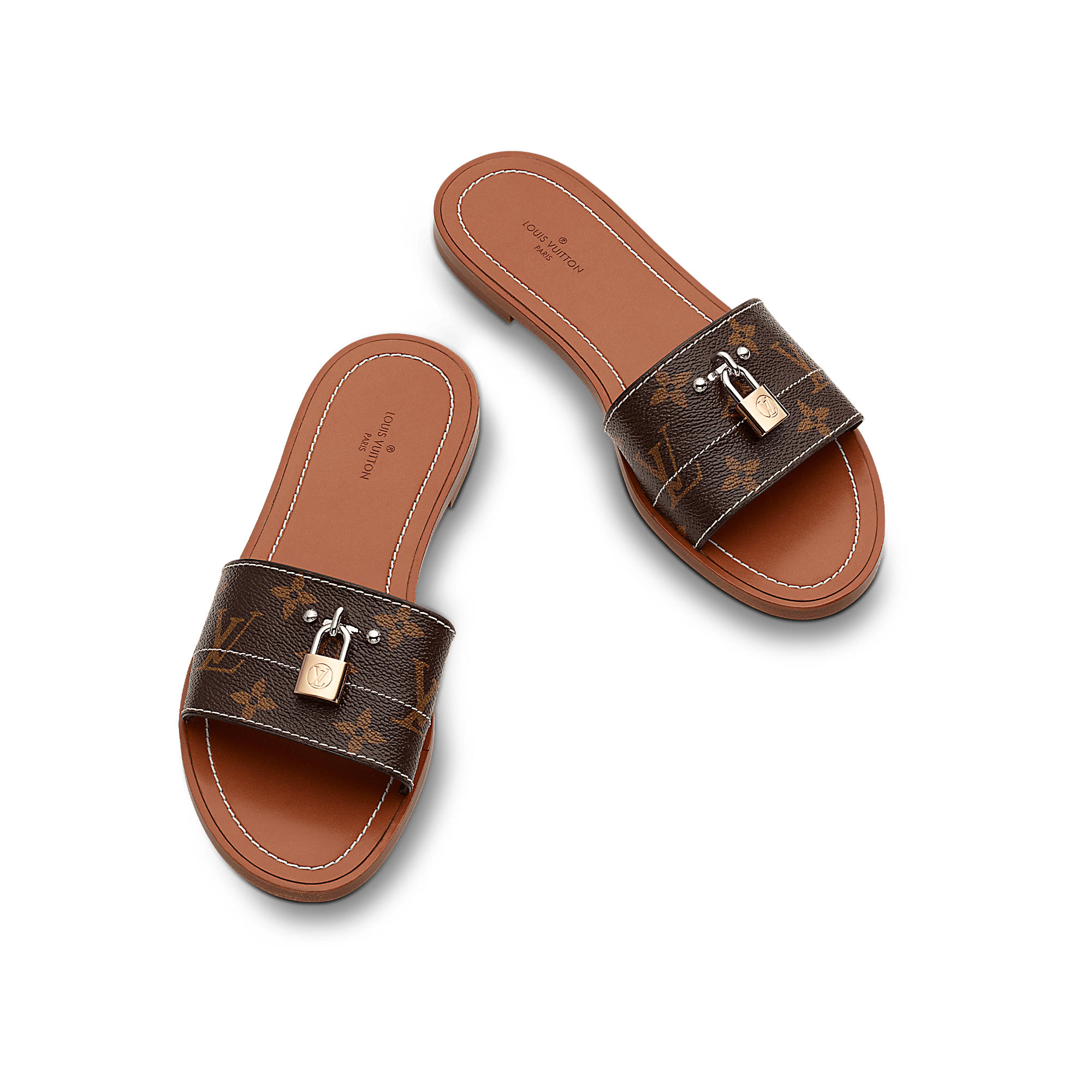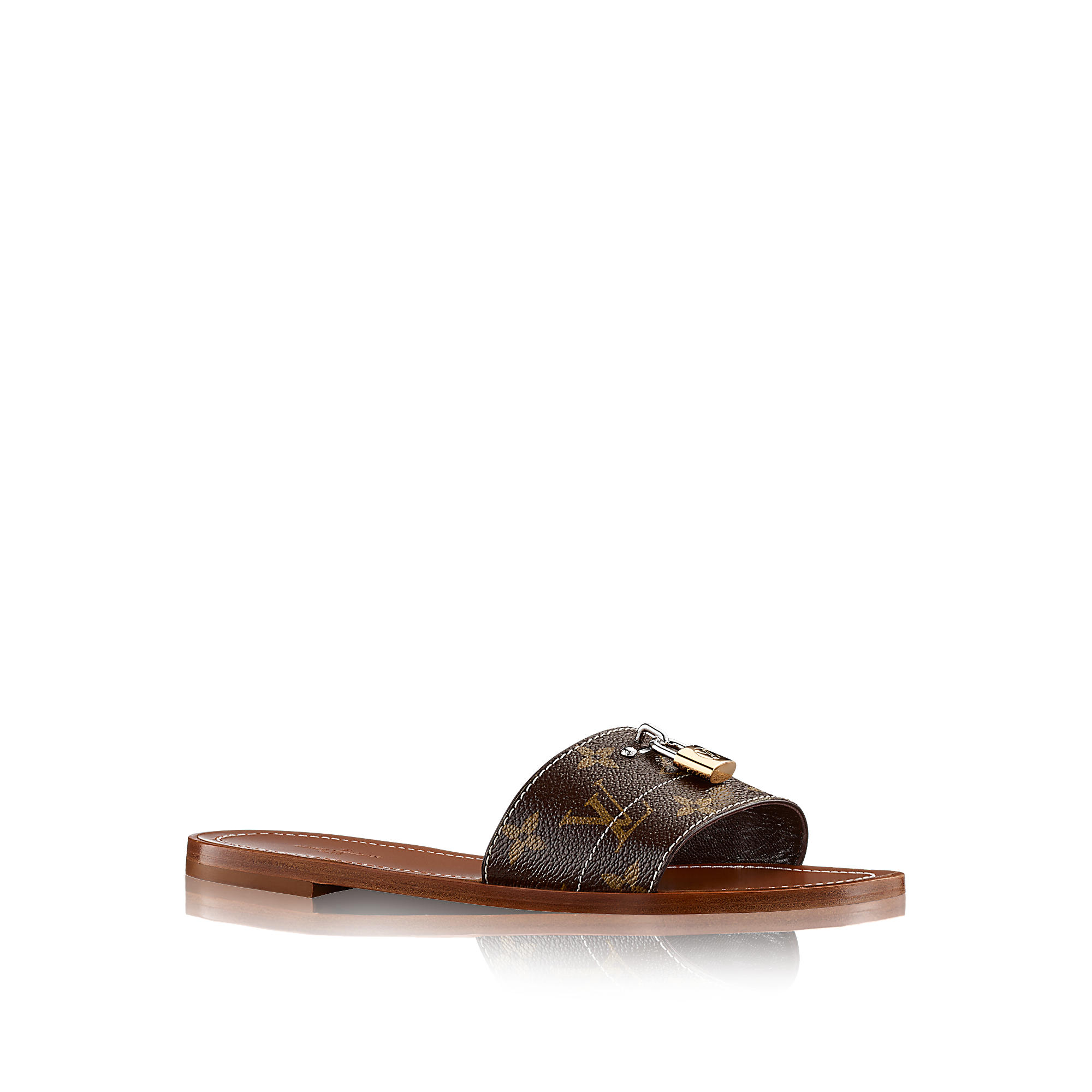 A must-have for warm weather, this timelessly chic flat mule is embellished with an LV-engraved padlock accessory.