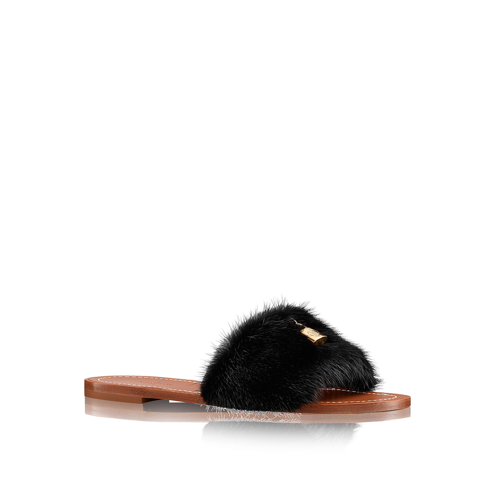 A must-have for warm weather, this fashionable flat mule in luxurious mink fur is embellished with an LV-engraved padlock accessory.