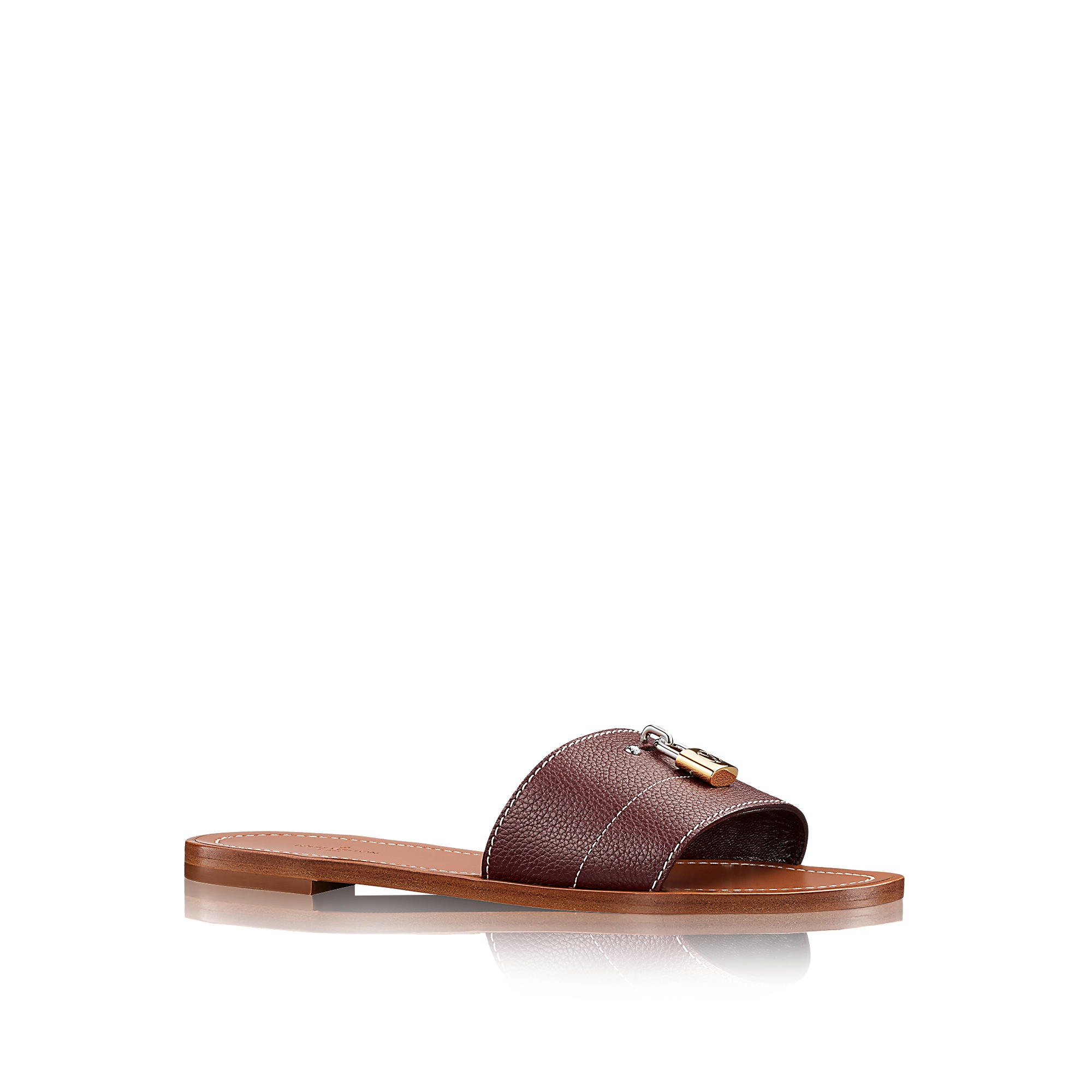 This chic flat mule is embellished with an LV-engraved padlock accessory.