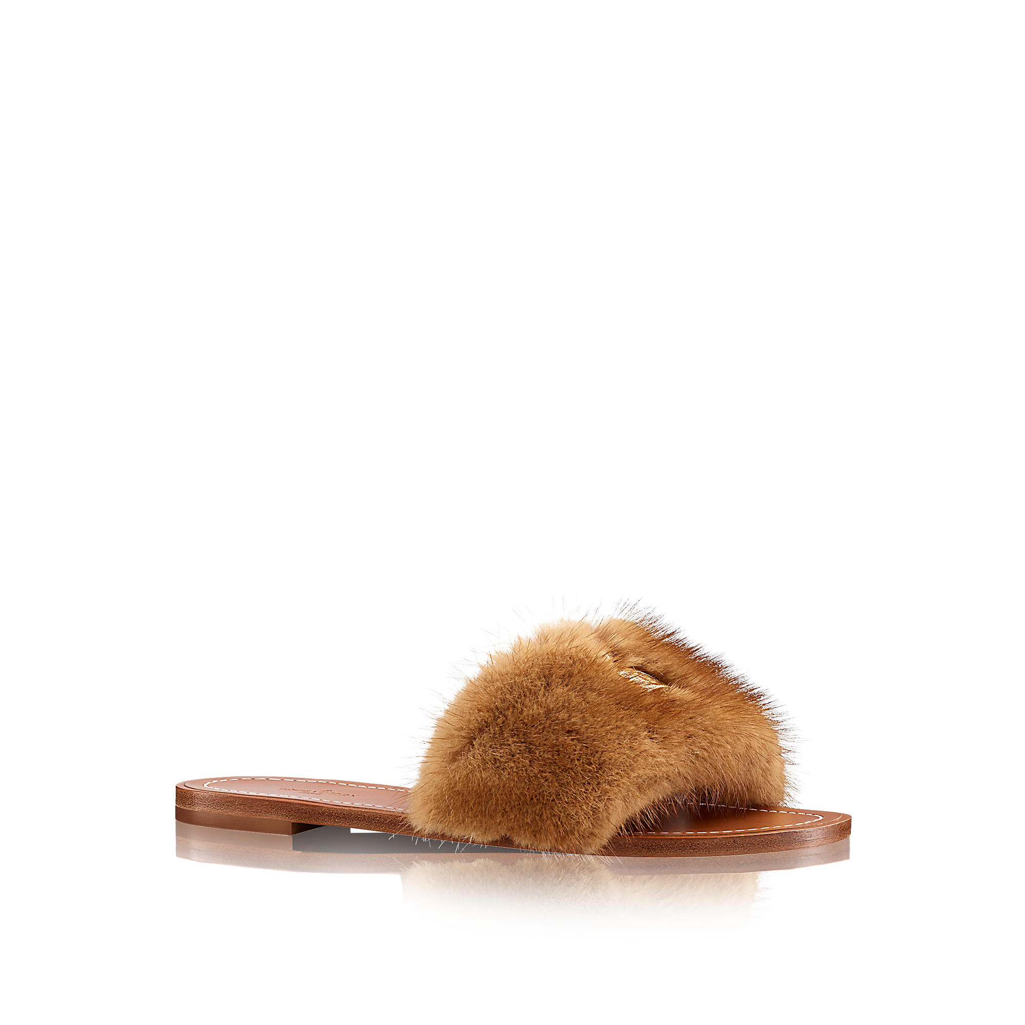 A must-have for warm weather, this fashionable flat mule in luxurious mink fur is embellished with an LV-engraved padlock accessory.
