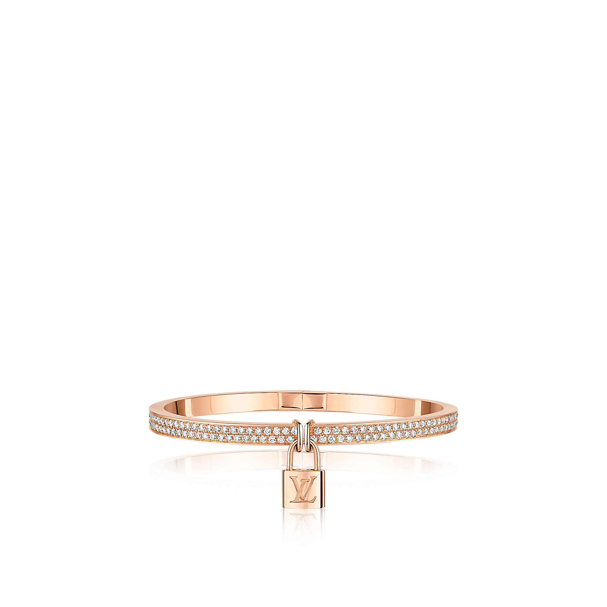 The padlock and keys, two iconic codes of Louis Vuitton, have been adorning bags and protecting the most precious belongings of our clients since the Steamer bag in 1901. In the Lockit Fine Jewellery collection, they become an audacious way to symbolize protection and attachment. Indeed, they echo the universal ”lovelocks” tradition: legend has it that attaching a padlock to the railing of bridges before throwing away the key into the water will seal love forever. With its LV padlock that locks the bracelet as a clasp, this bracelet in pink gold enhanced by a stunning diamond paving, evokes the closing system of the historic Steamer bag. The back of the bracelet features a hinge, adorned with the LV nails. The bracelet is presented with a set of keys on a pink gold chain to be worn by the loved one.