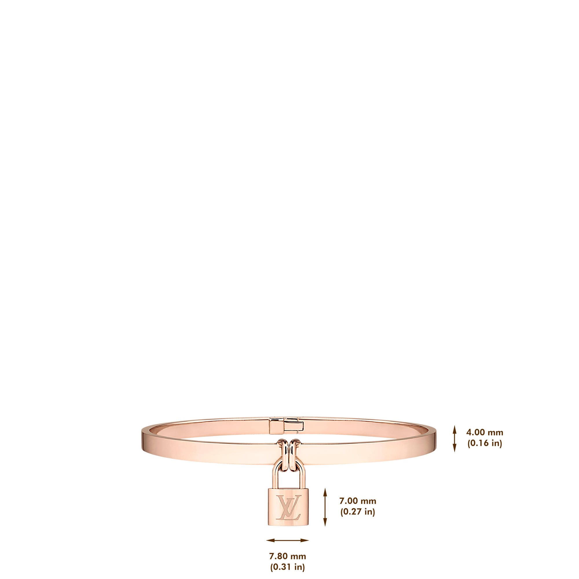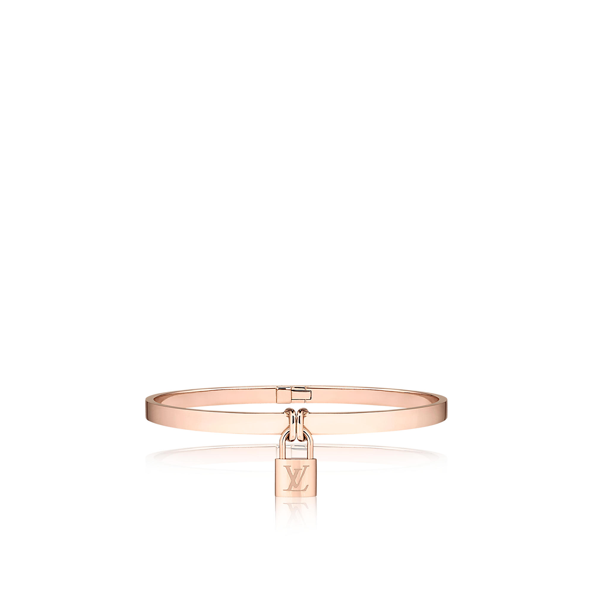 The padlock and keys, two iconic codes of Louis Vuitton, have been adorning bags and protecting the most precious belongings of our clients since the Steamer bag in 1901.In the Lockit Fine Jewelry collection, they become an audacious way to symbolize protection and attachment. Indeed, they echo the universal “lovelocks” tradition: legend has it that attaching a padlock to the railing of bridges before throwing away the key into the water will seal love forever. With its LV padlock that locks the bracelet as a clasp, this graceful pink gold bracelet evokes the closing system of the historic Steamer bag. The back of the bracelet features a hinge, adorned with the LV nails.