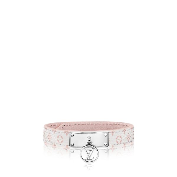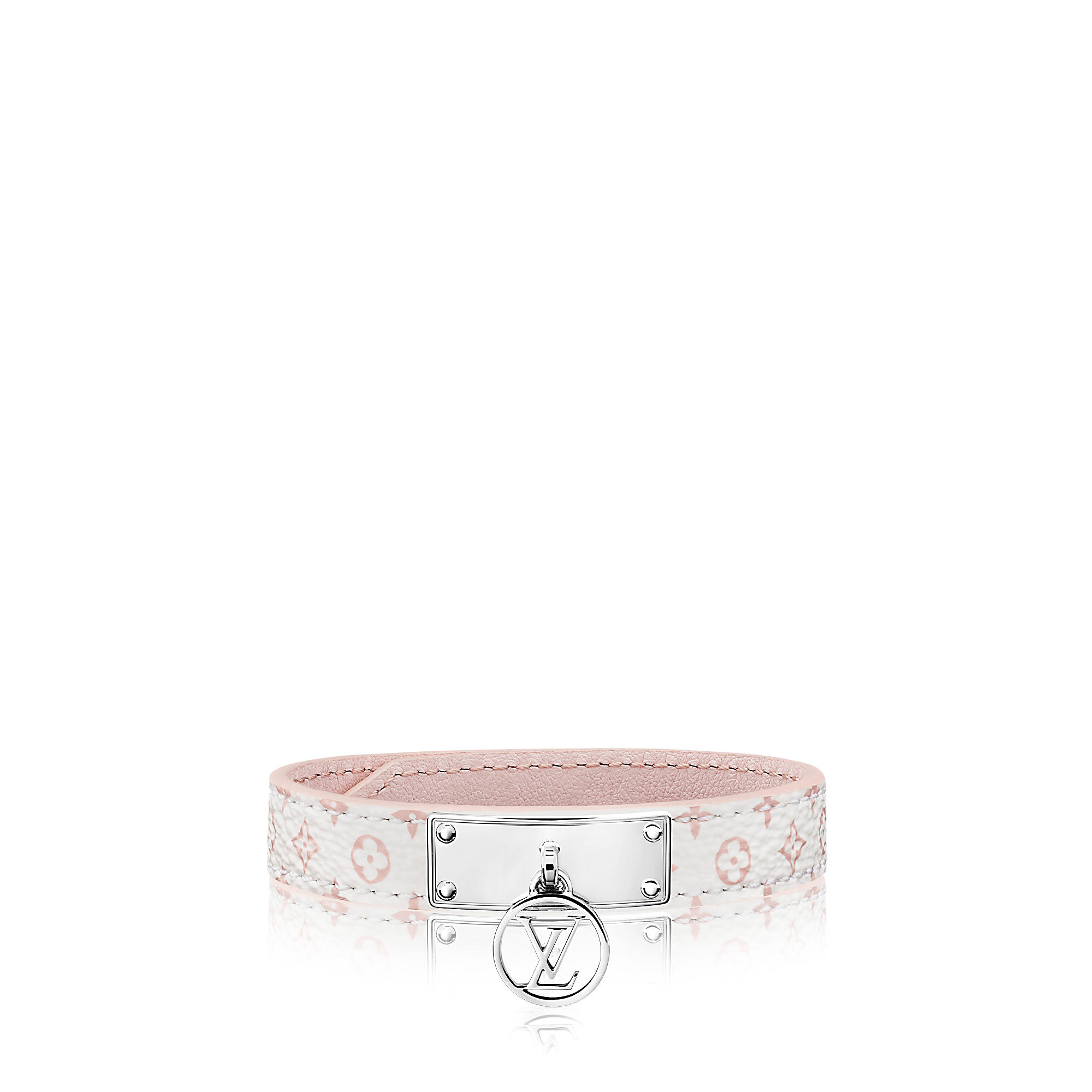 Colourful animation of our permanent Logomania bracelet reinterpreted in new summery pink hues of the iconic Monogram Canvas. The signature on the golden plaque and the LV Circle charm add a fashionable touch to this bracelet