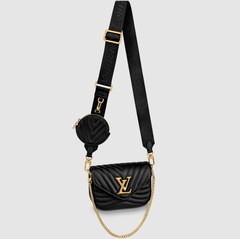 Louis Vuitton introduces the versatile New Wave Multi-Pochette crossbody handbag in quilted cowhide leather. With its wide strap, featuring an embroidered “Louis Vuitton” signature, gold-color chain for hand or short shoulder carry, and round coin purse clipped on the strap’s snap hook, all removable, it is the very definition of a versatile fashion accessory.
