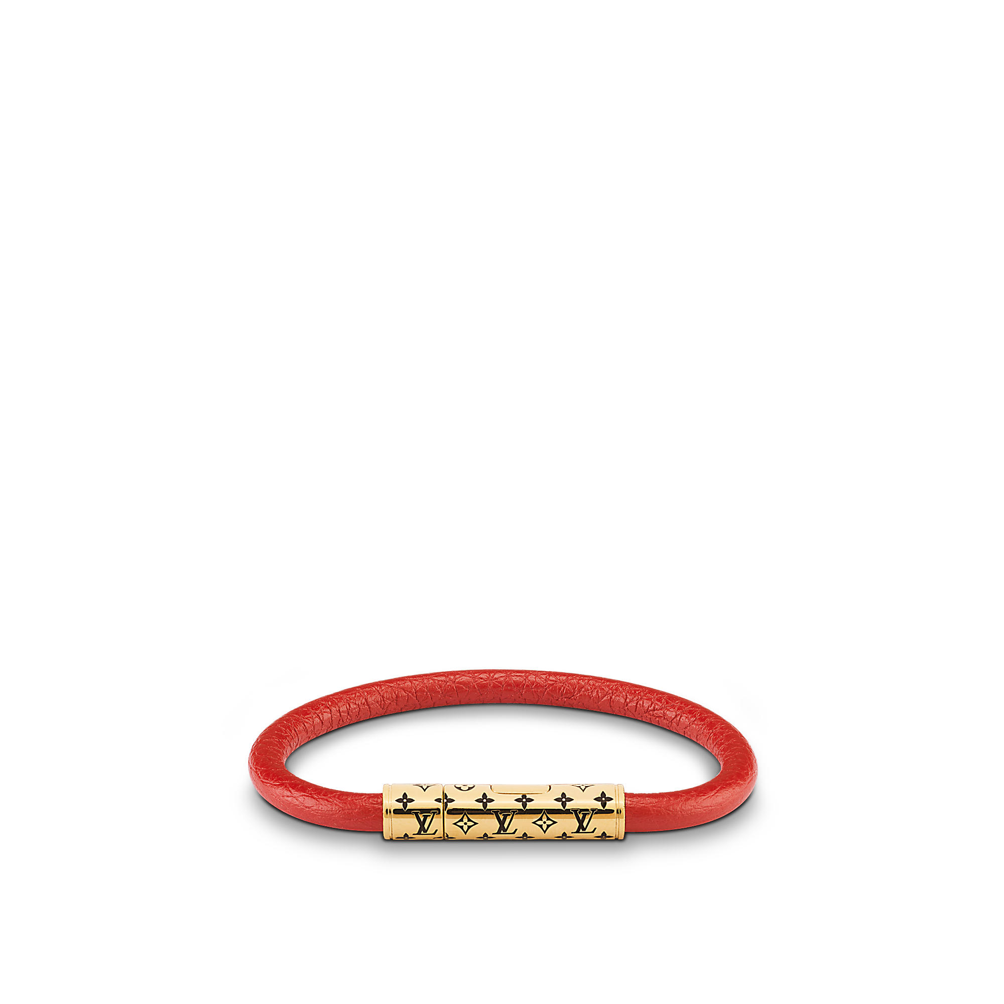 The best-selling LV Confidential bracelet is now offered in a rainbow of new hues. Ingrained calf leather or Monogram canvas, they feature engraved metal fasteners with lacquer or gold-colour finishes. Stacked, they make an eye-catching fashion statement.