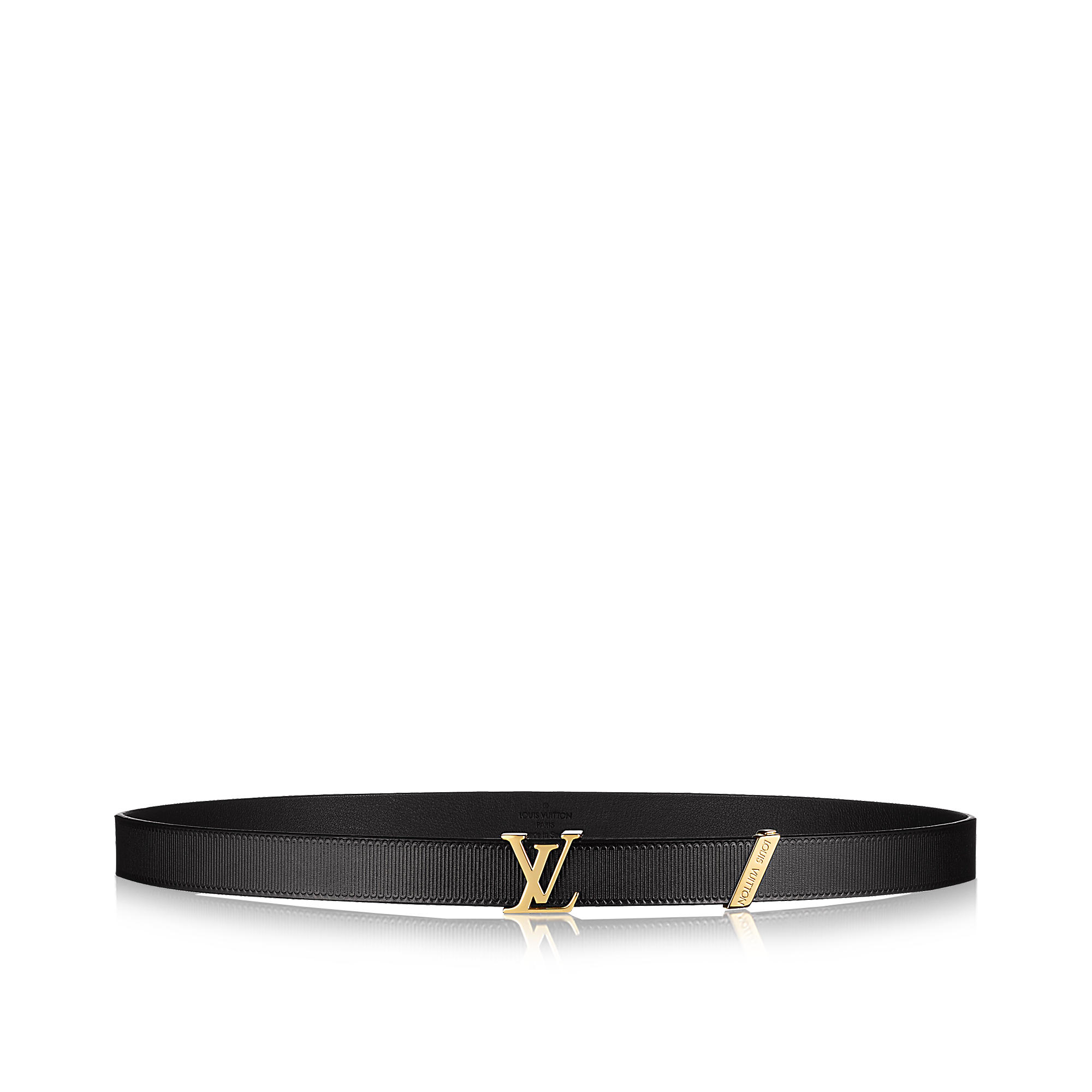 This timeless elegant black evening belt is embossed with a pattern recalling the gros grain ribbon used in couture. The LV Initiales buckle in shiny gold metal complements this sophisticated design, which will enhance any outfit.