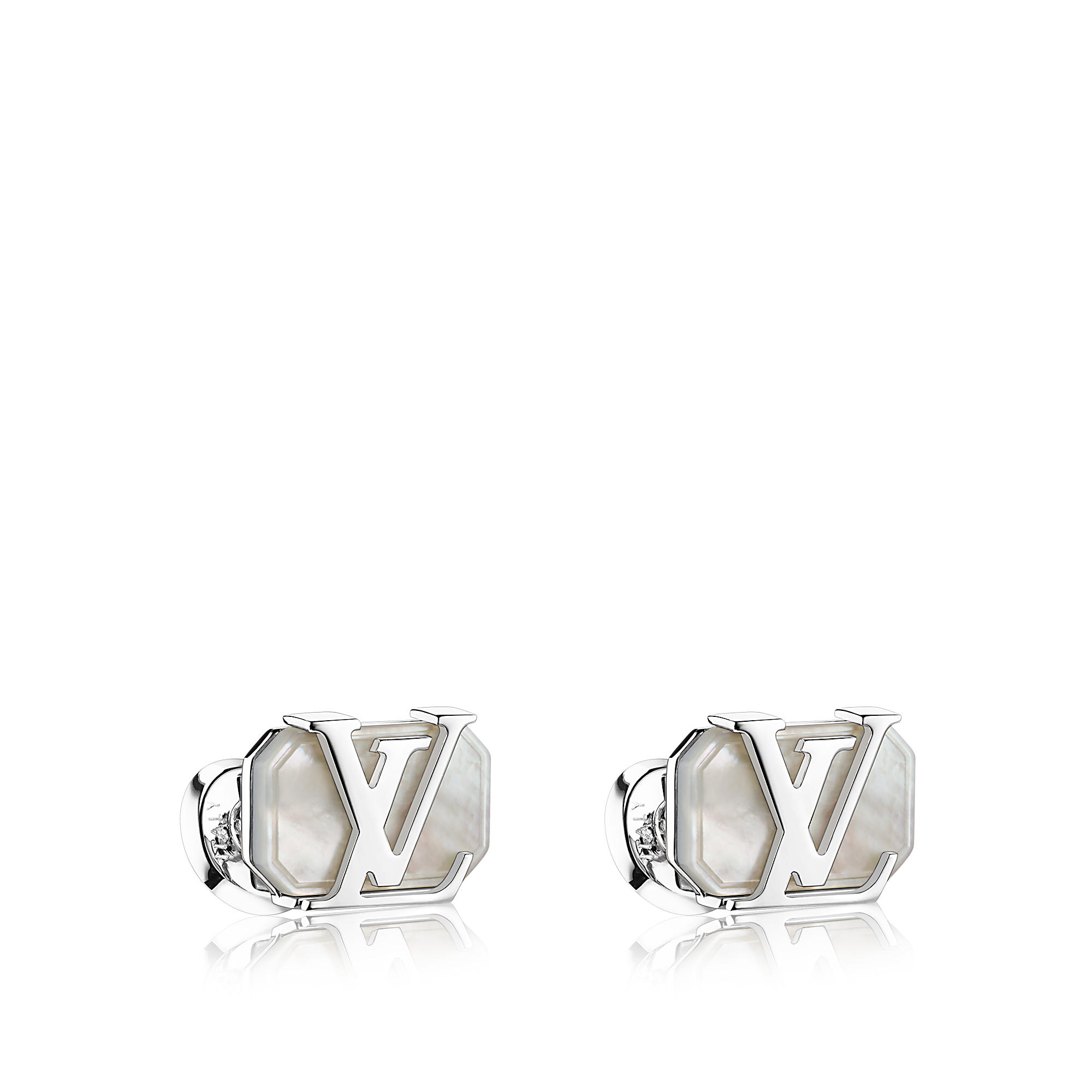 The LV Initiales line of masculine accessories adds sleek sophistication to business or evening looks. The tie clip is impeccably crafted of polished palladium, while the coordinated cufflinks mix metal with natural horn or mother-of-pearl.