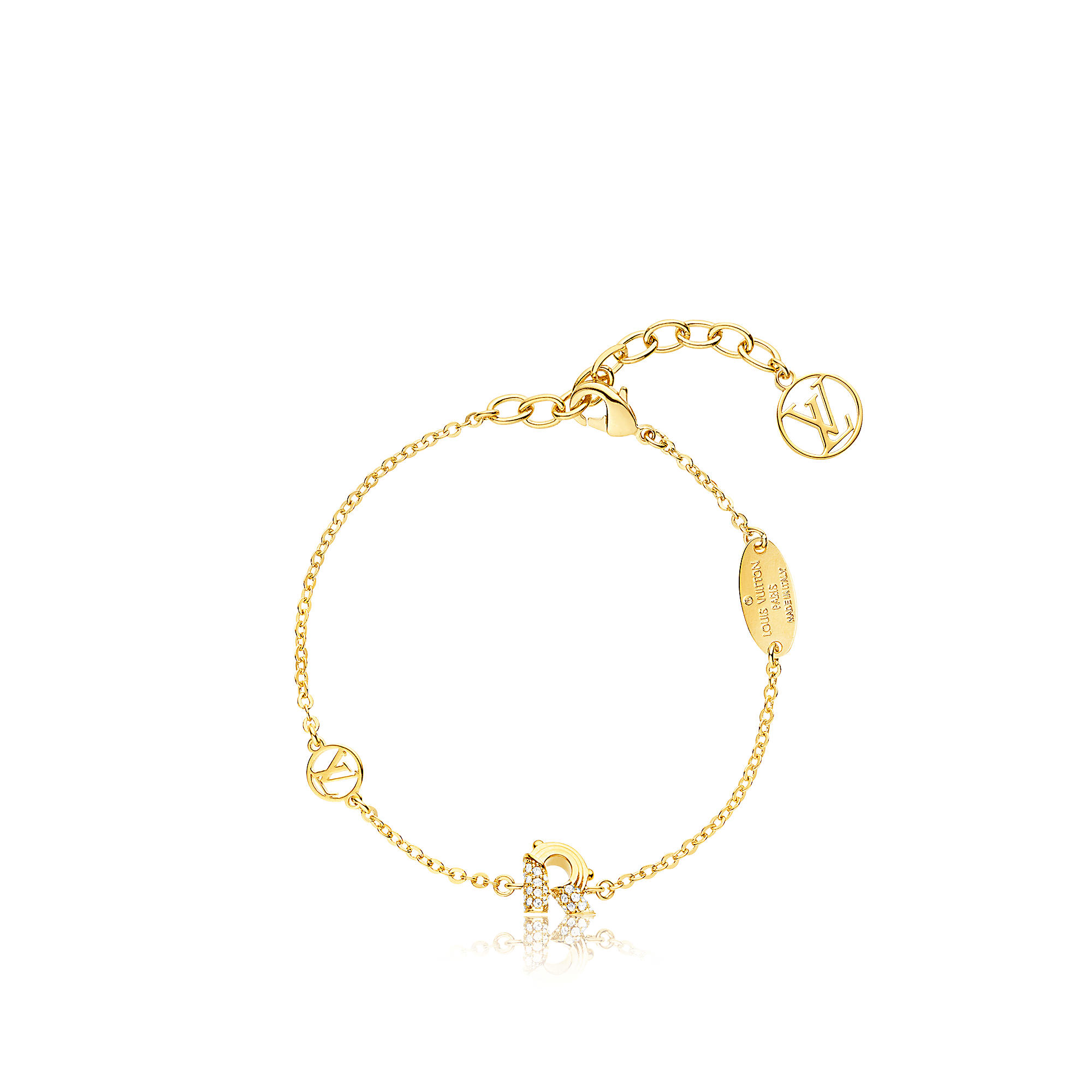 A sparkling, very feminine addition to the LV & Me alphabet, this new interpretation presents letters crafted of golden metal and set with micro-pavé strass. Each piece is painstakingly polished, engraved and finished. A perfect personalized gift!