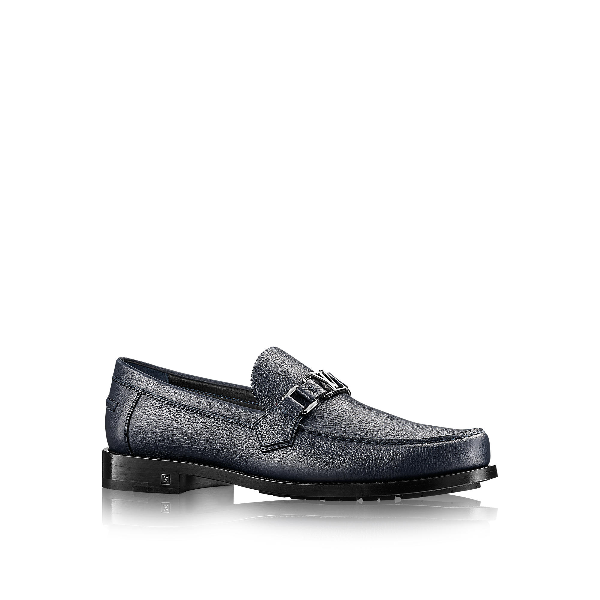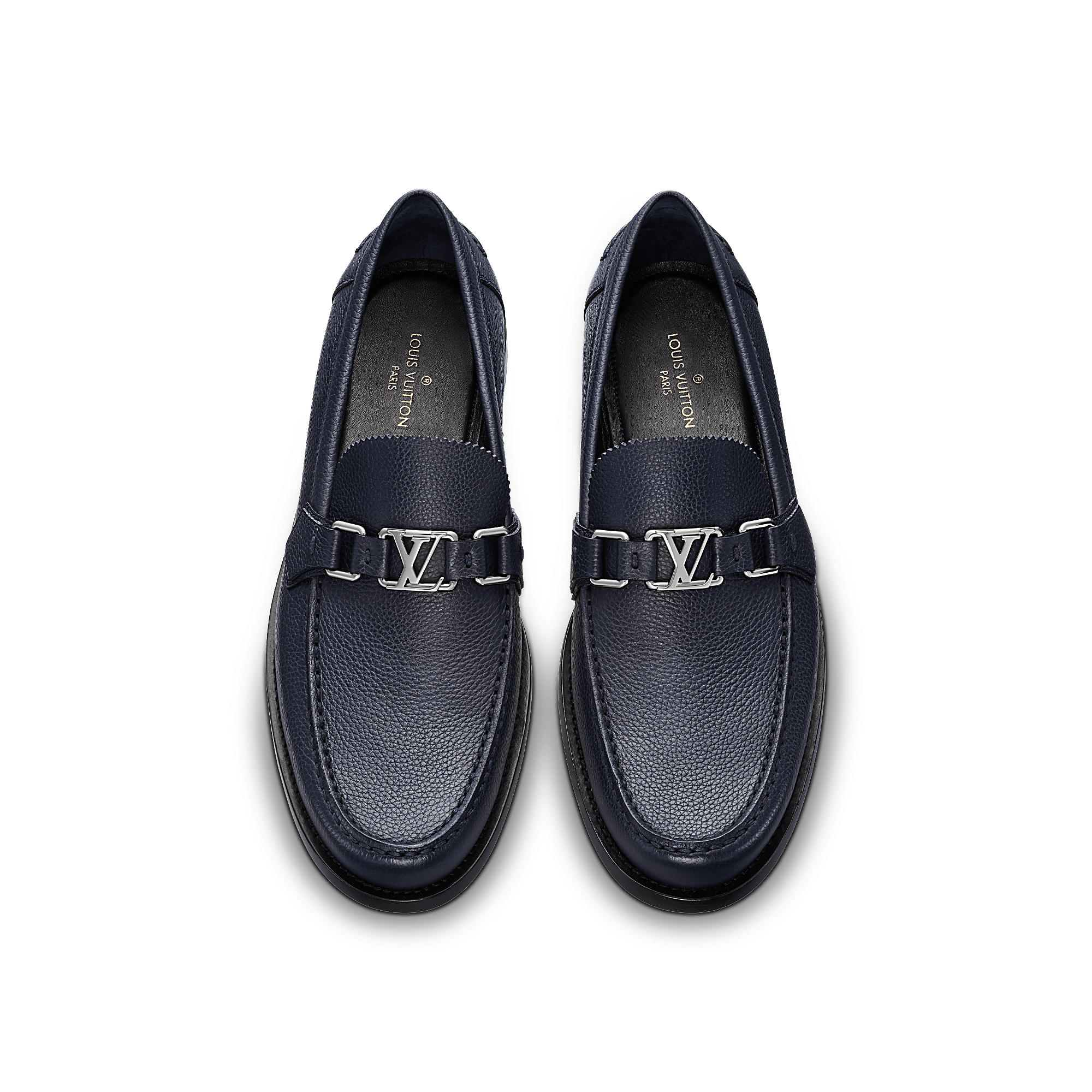 Loafer in grained calf leather, leather outsole wih rubber inserts and LV initials accessory.