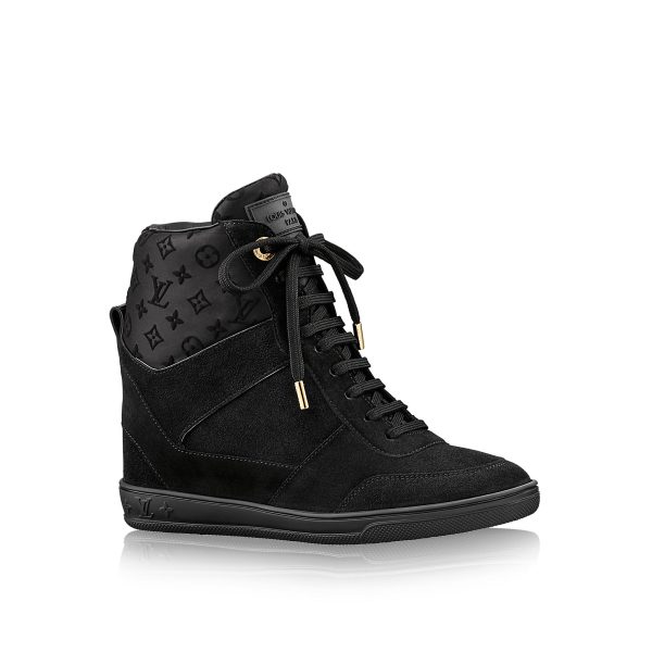 This trendy wedge sneaker in suede calf leather is trimmed with Monogram nylon for a discreetly stylish signature.