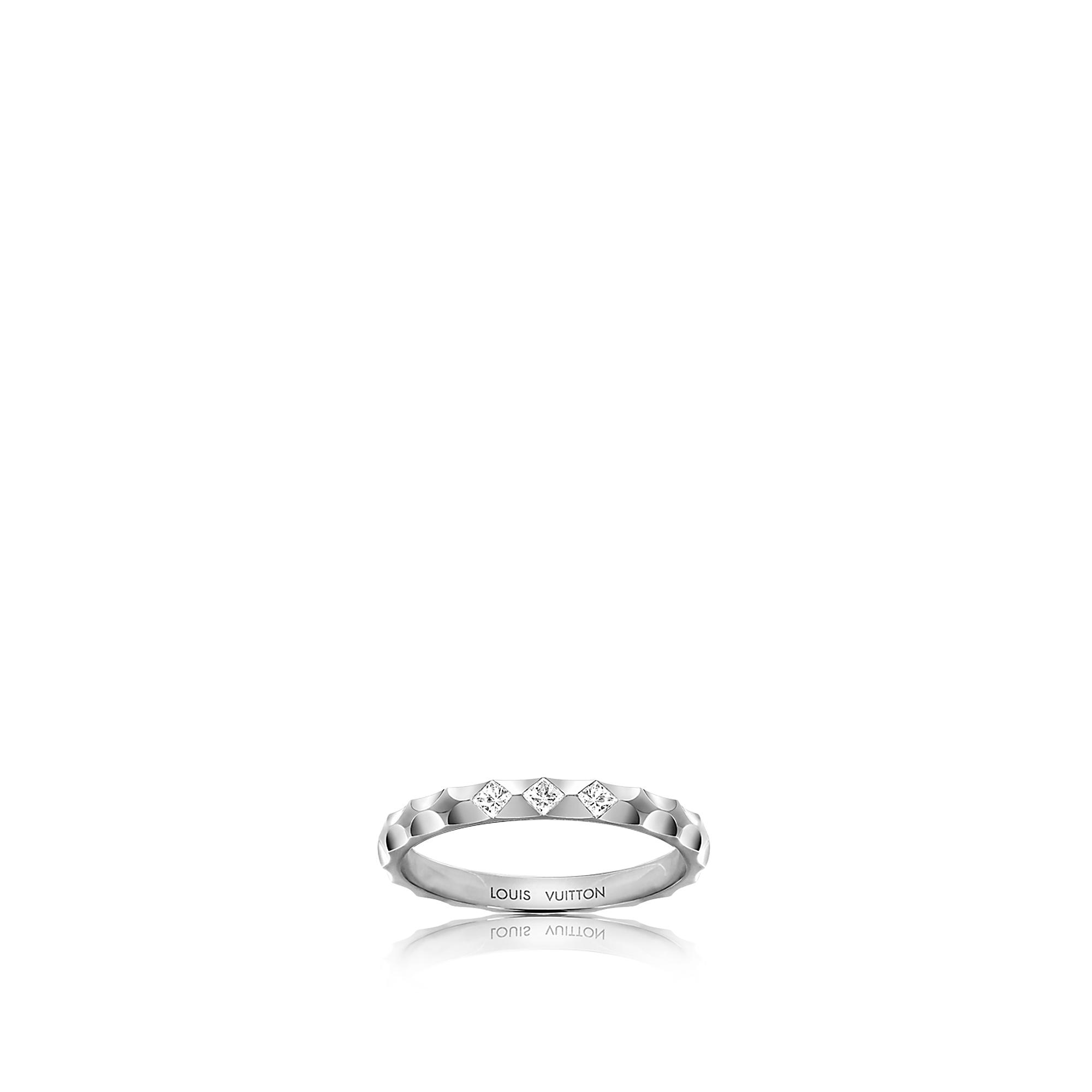 The Monogram Infini wedding band is sculpted with a pattern inspired by Louis Vuitton’s Monogram and the architecture grid. This delicate motif is engraved all around the ring, symbolizing an endless love between two people who are embarking on a lifetime journey together. In white gold enhanced by three sparkling princess-cut diamonds, it proclaims an eternal love