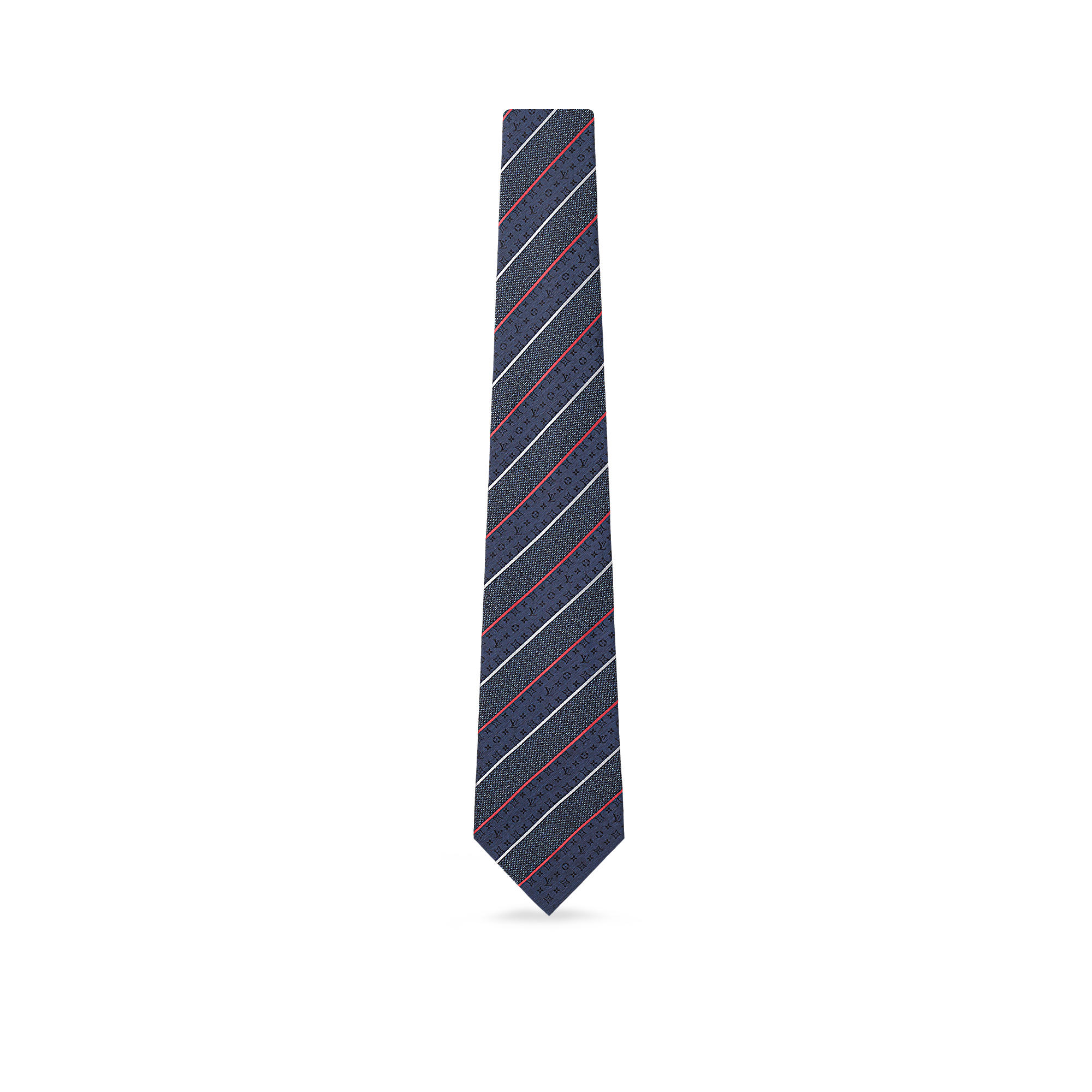 This classic business tie subtly references Louis Vuitton’s iconic Monogram pattern with discreet Monogram motifs printed in lines within the stripes.