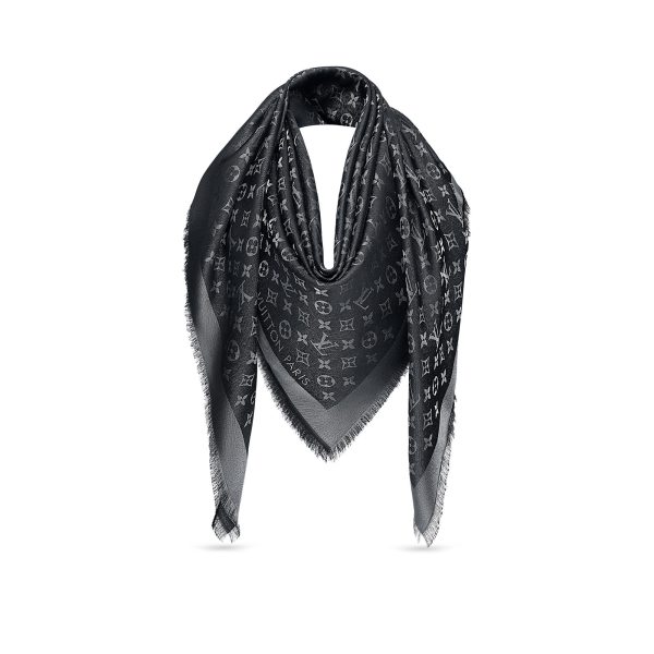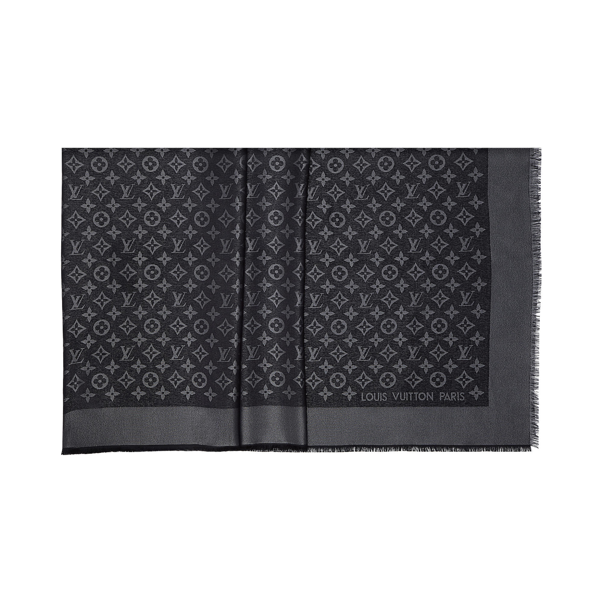 This sophisticated shawl, woven with a tone-on-tone Monogram pattern, is given a subtle shimmer by the use of a soft shine yarn.
