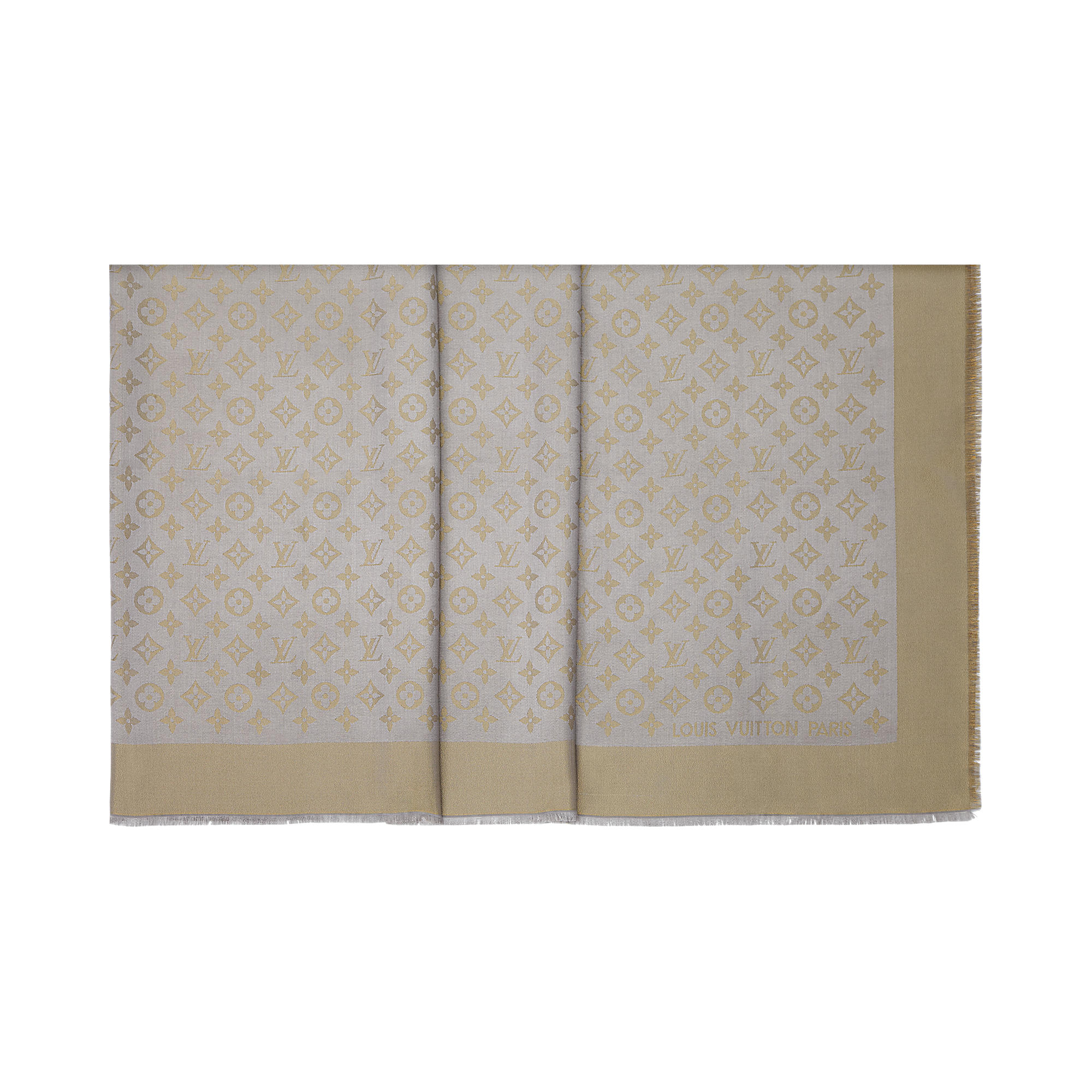 This sophisticated shawl, woven with a tone-on-tone Monogram pattern, is given a subtle shimmer by the use of a soft shine yarn.