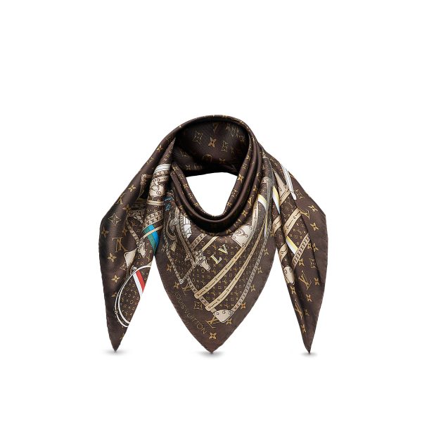 Inspired by the theme of travel, this striking silk twill square combines the instantly recognizable Monogram pattern with references to Louis Vuitton’s historic luggage designs.