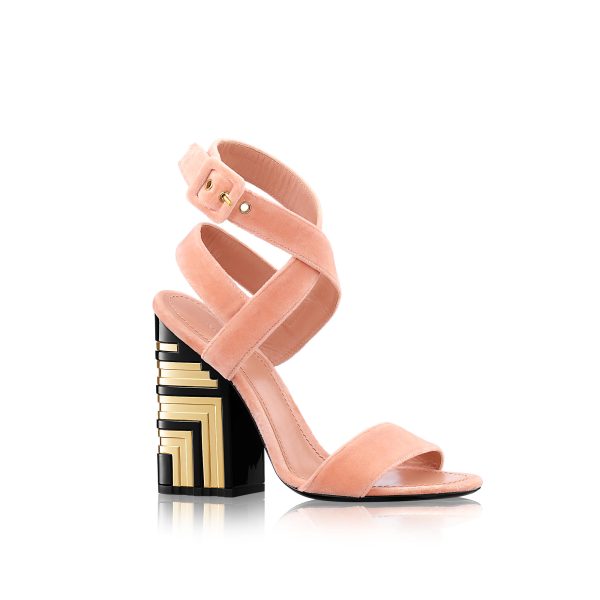 This ankle-strap sandal contrasts a smooth velvet upper with a stunning hand-crafted block heel inspired by Art Deco architecture. Both comfortable and fashionable, it is a perfect dawn-to-dark look.