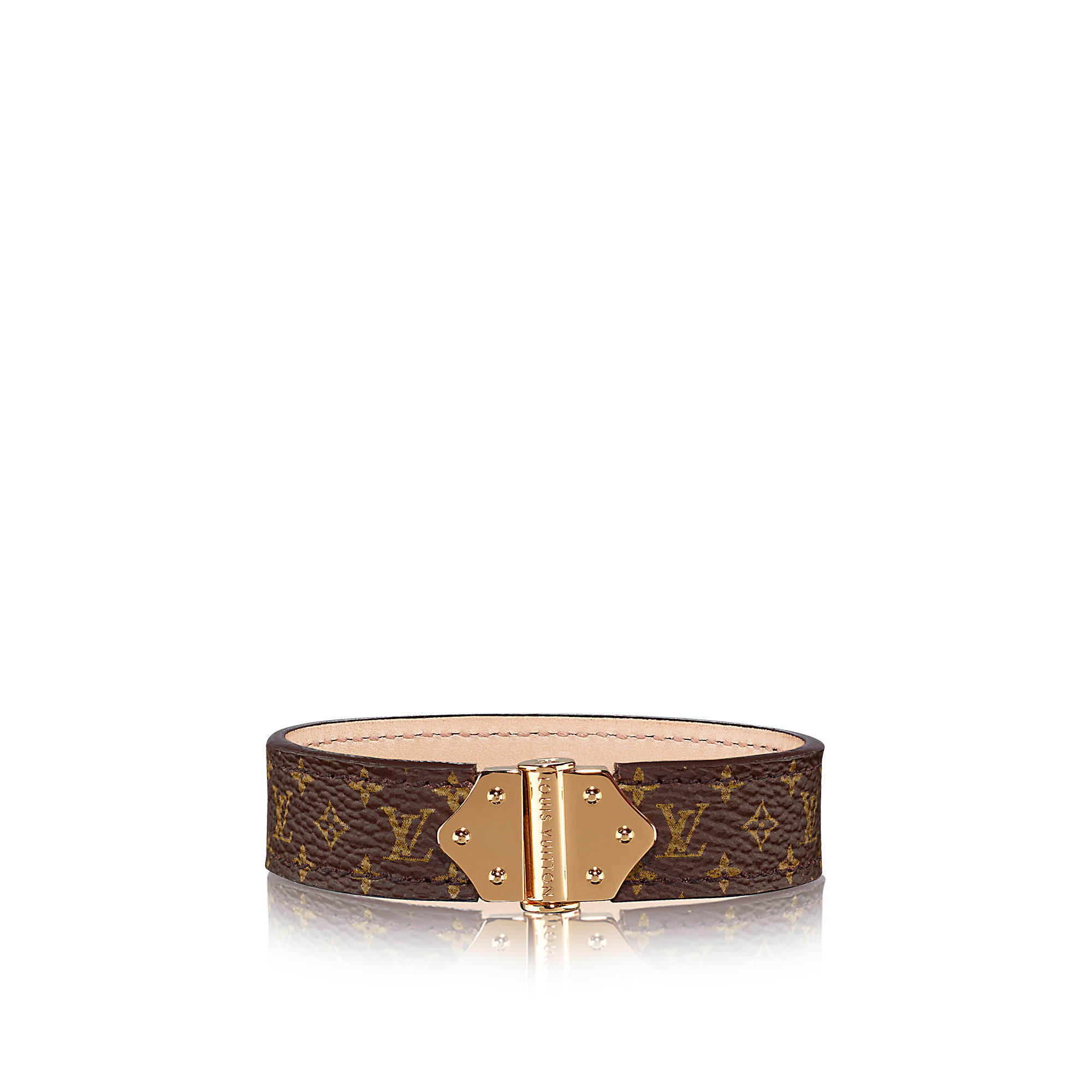 A sophisticated and instantly identifiable accessory, the Spirit Nano Monogram bracelet is crafted from a specially scaled-down version of Monogram canvas. The distinctive golden clasp, engraved with the Louis Vuitton signature, was inspired by trunk hinges.