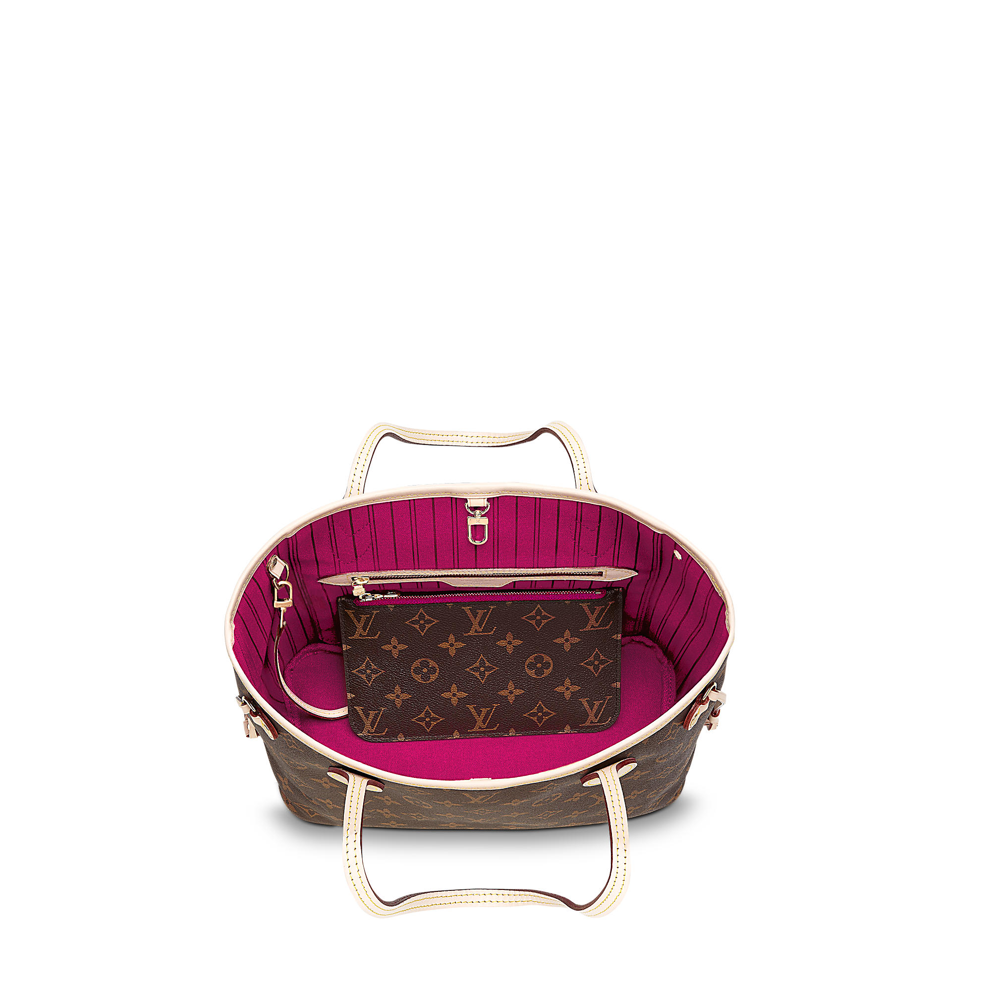 Louis Vuitton celebrates the Neverfull with a new version of this iconic bag, in a smaller size perfect for city wear. The redesigned interior features a fresh textile lining and heritage details inspired by House archives. Best of all, the removable zippered clutch can be carried separately as a chic pochette or serve as an extra pocket. Linings in a selection of bright shades lend a pop of vivid colour to the timeless Monogram canvas.