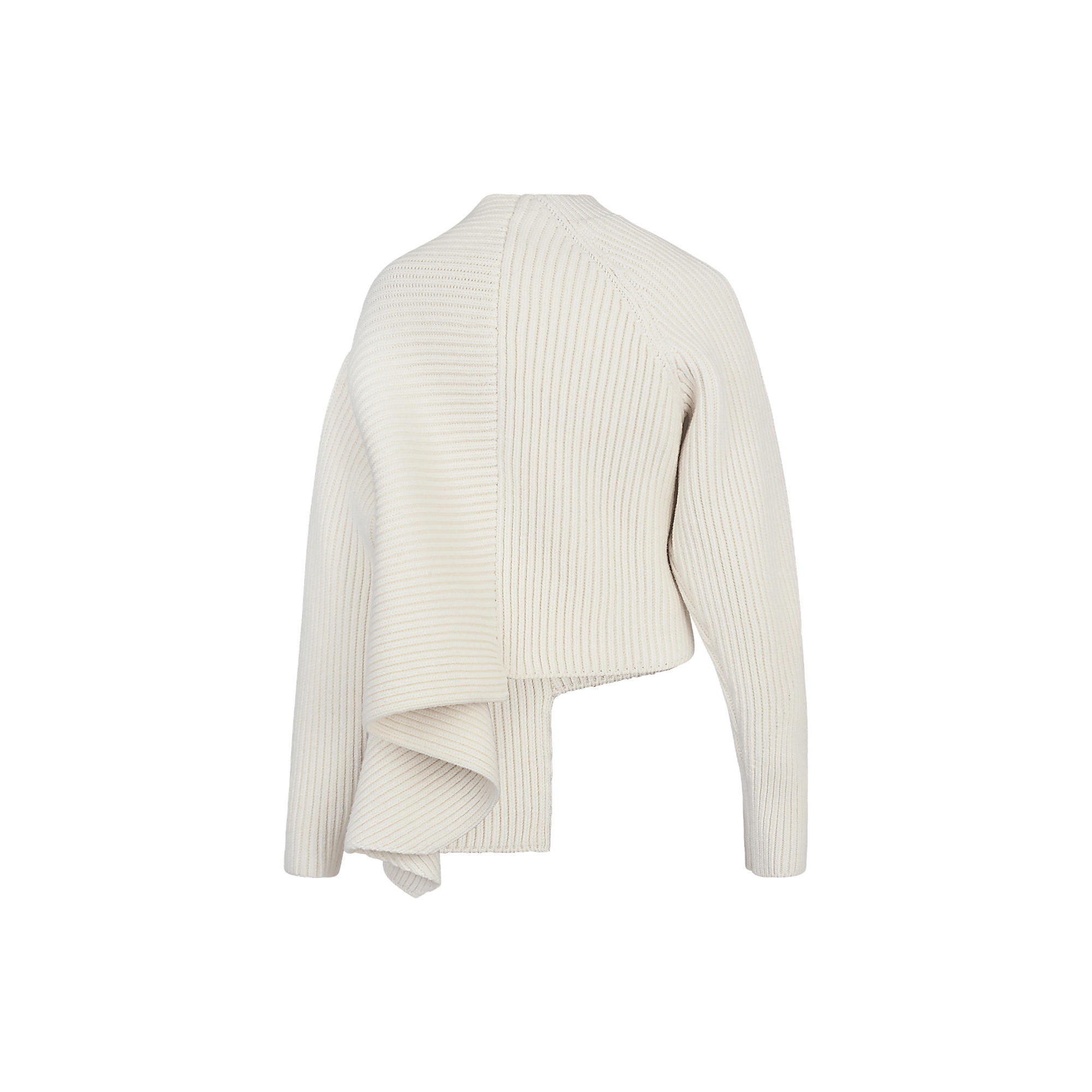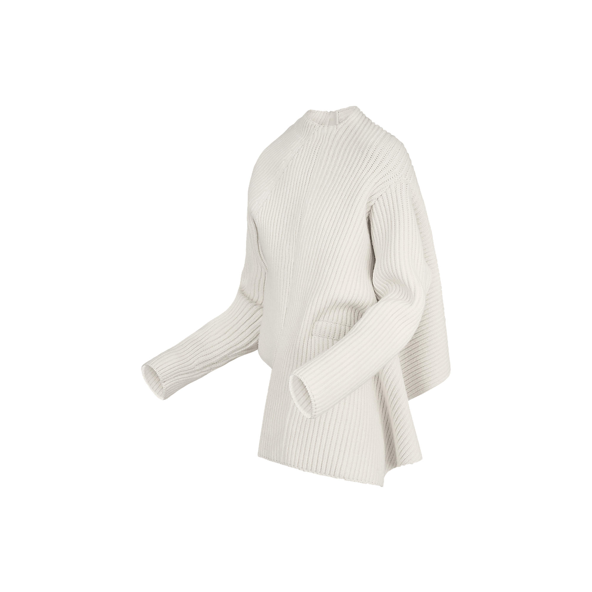 Continuing Nicolas Ghesquière’s emphasis on strong knitted pieces, this beautiful oversized sweater features an inside belt that creates a unique pulled-in effect on the side. It can be paired with cropped flared pants, or with this season’s leggings for a cool silhouette.