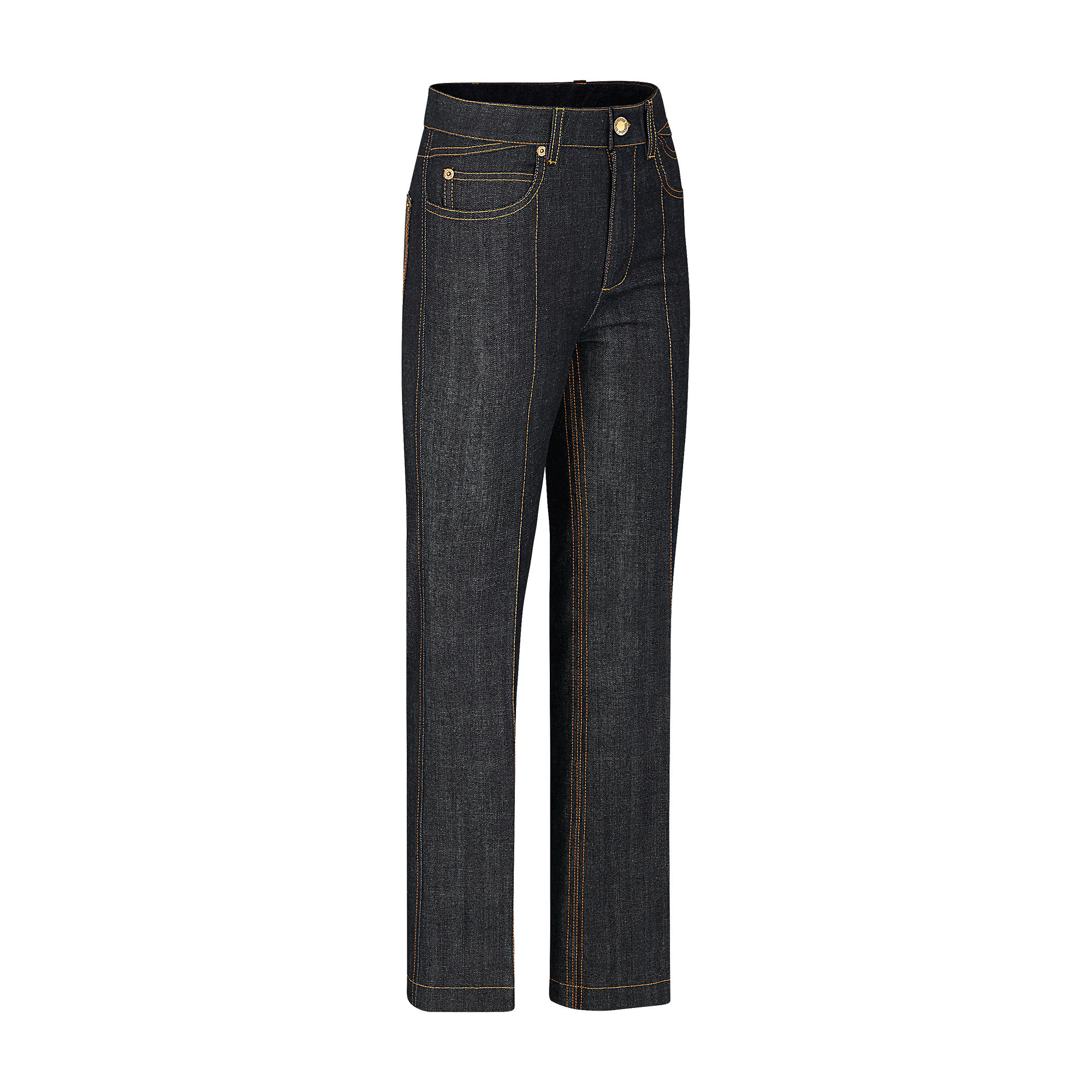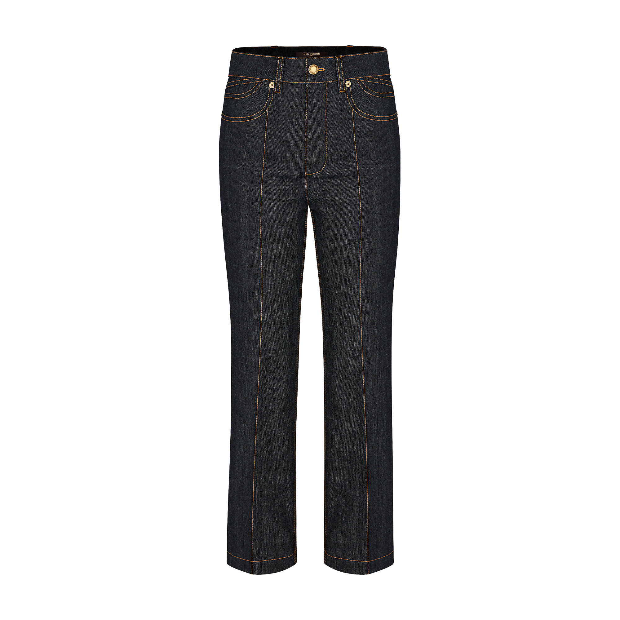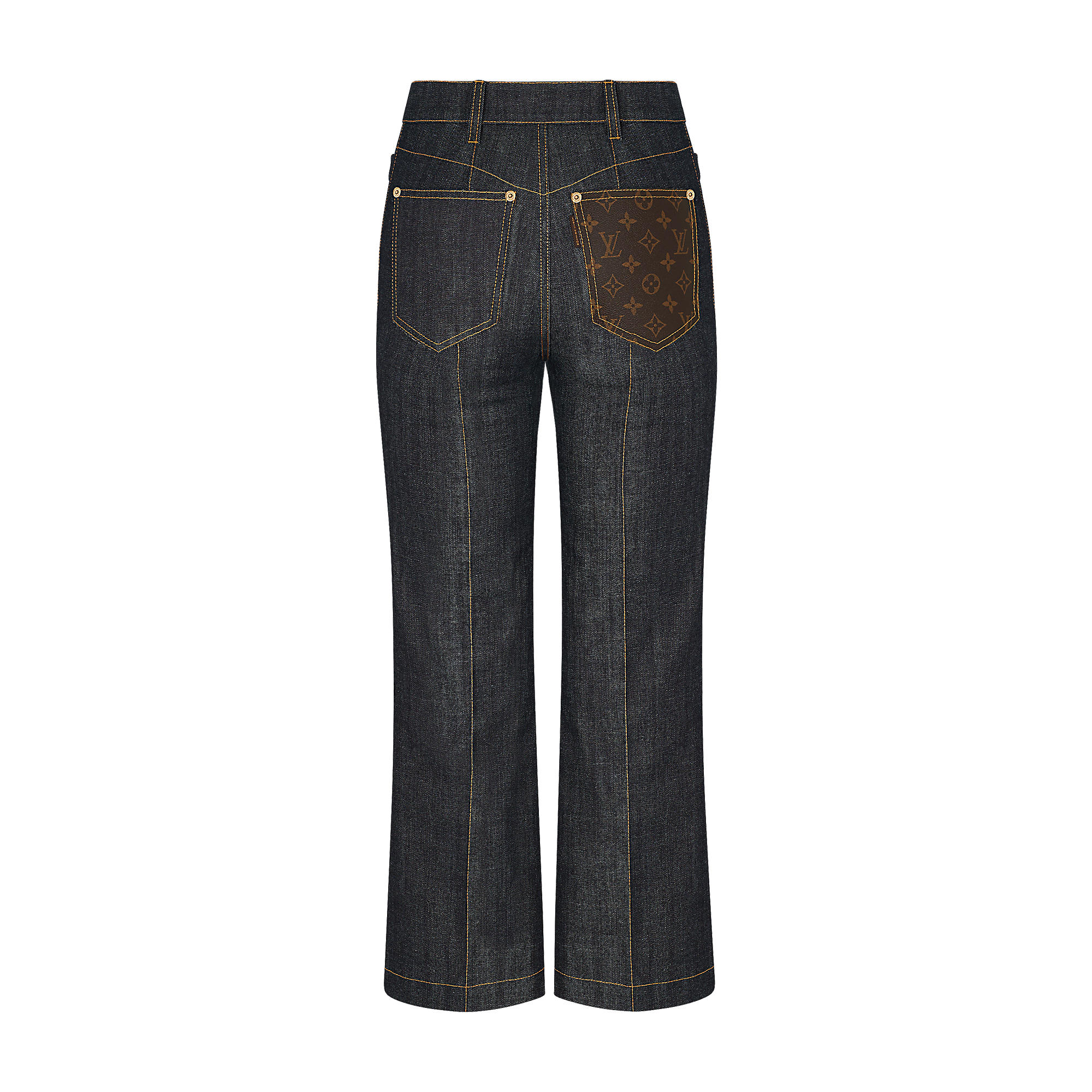 Flared and cropped, these jeans are cut from raw denim with contrasting orange overstitching. A back pocket in Monogram canvas offers a subtle Louis Vuitton signature.