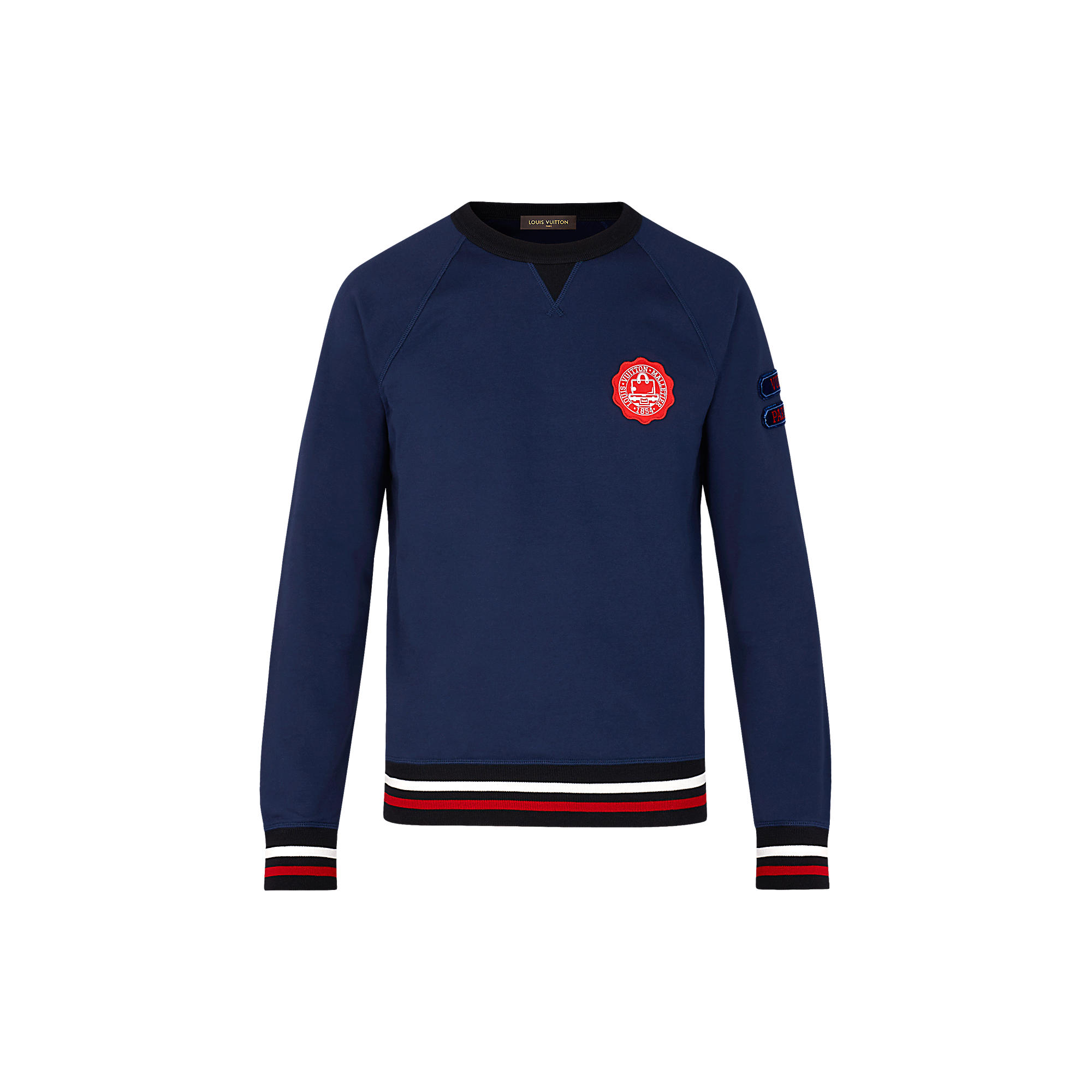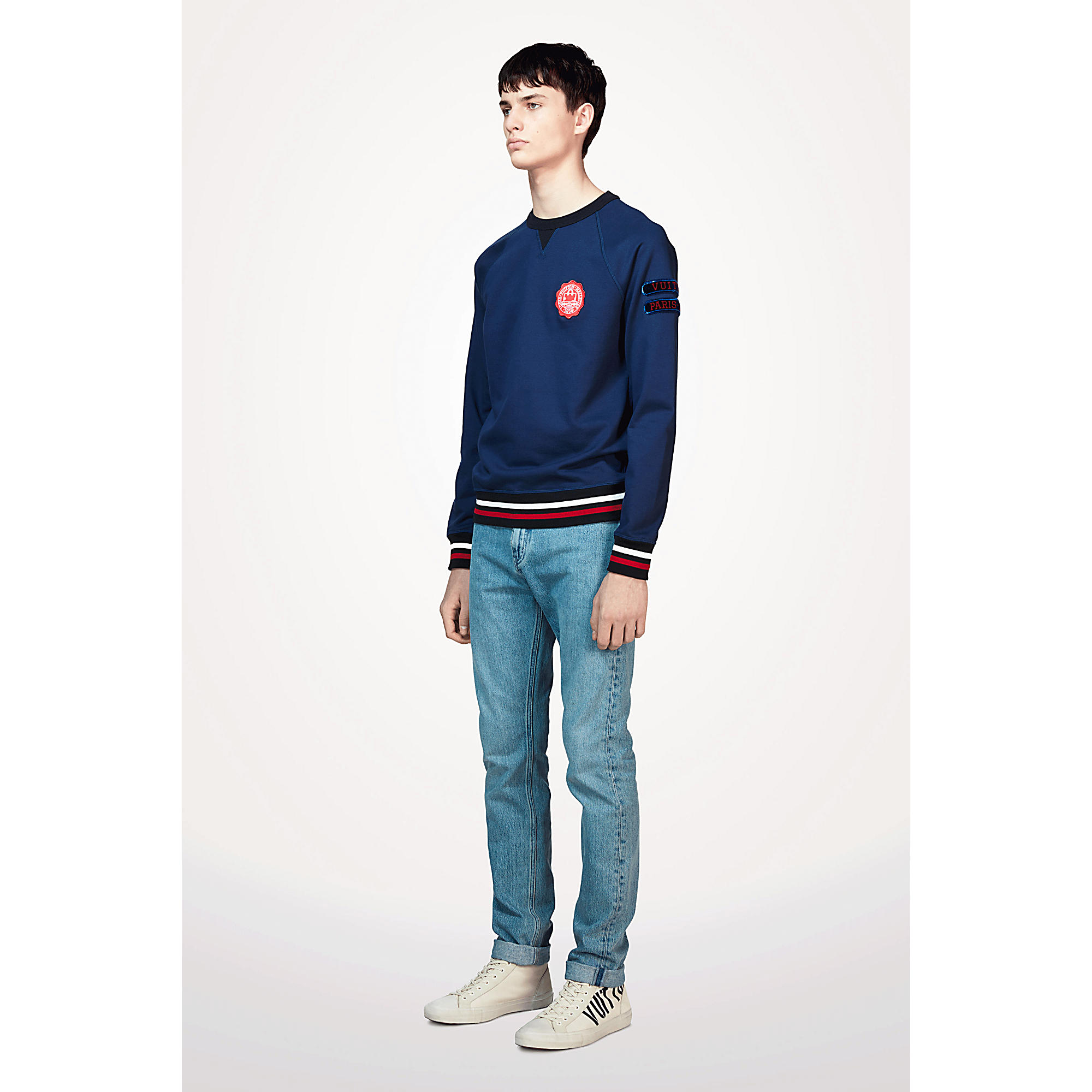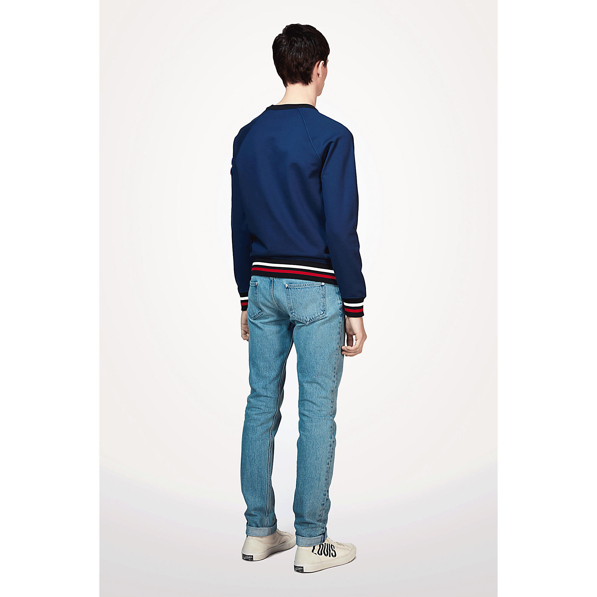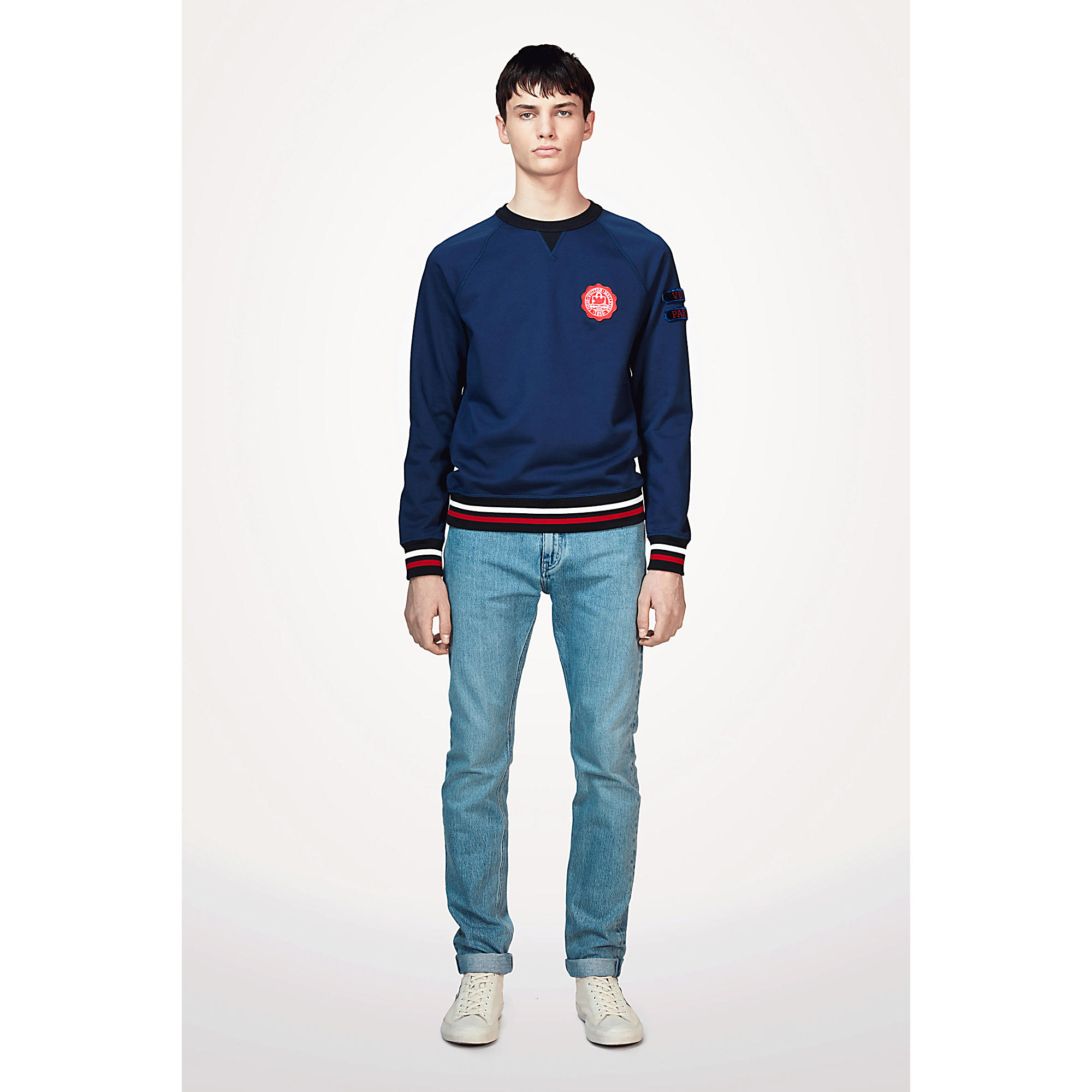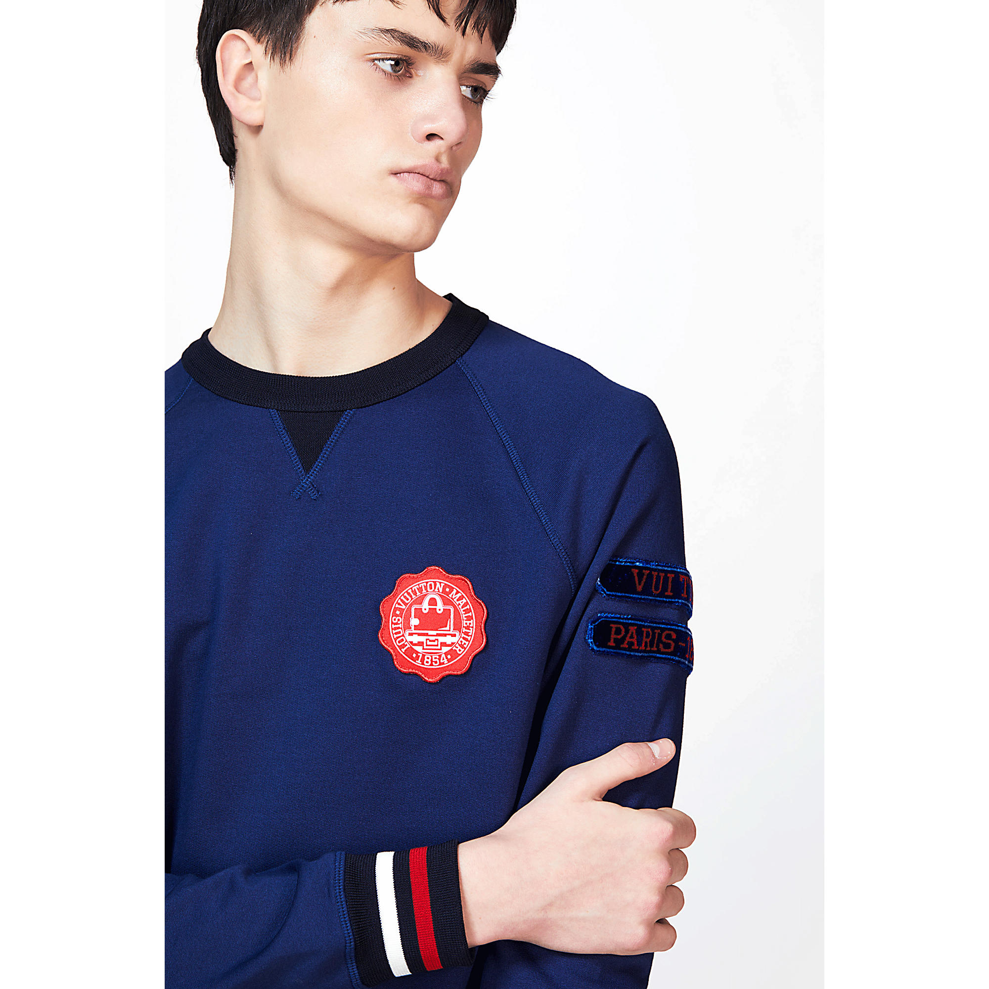 This sweatshirt highlights the collection’s preppy inspiration with its velvet patches on the sleeve and varsity-style signature embroidery on the chest.