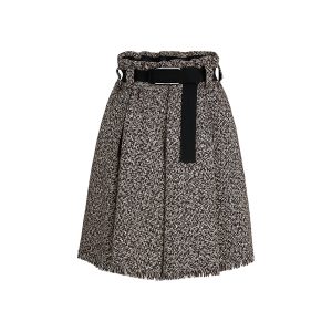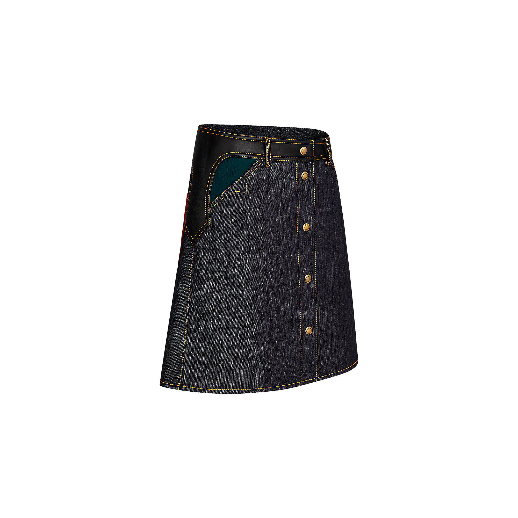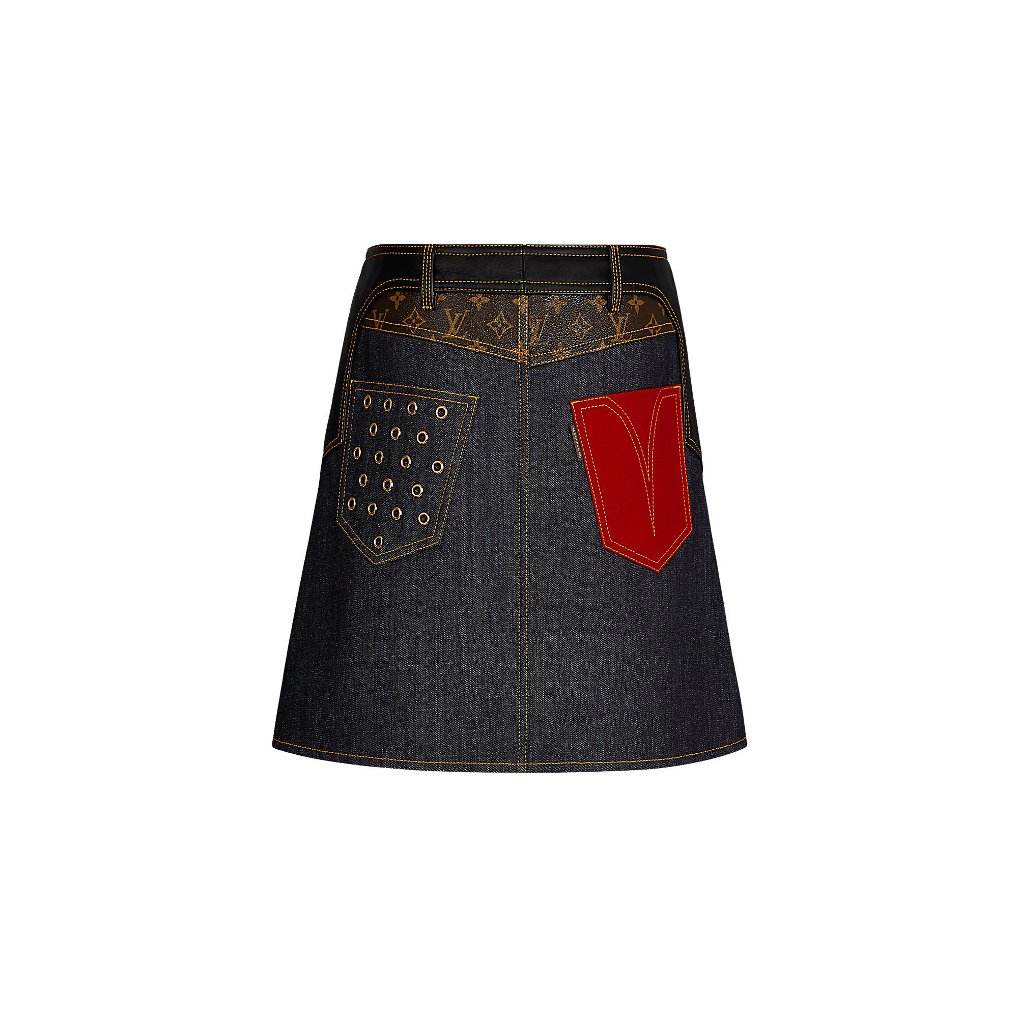 This A-line denim skirt features cut-out details on the side that recall the handles of the Maison’s iconic trunks. One back pocket is adorned with metallic eyelets, while the other is red with curved V overstitching.