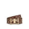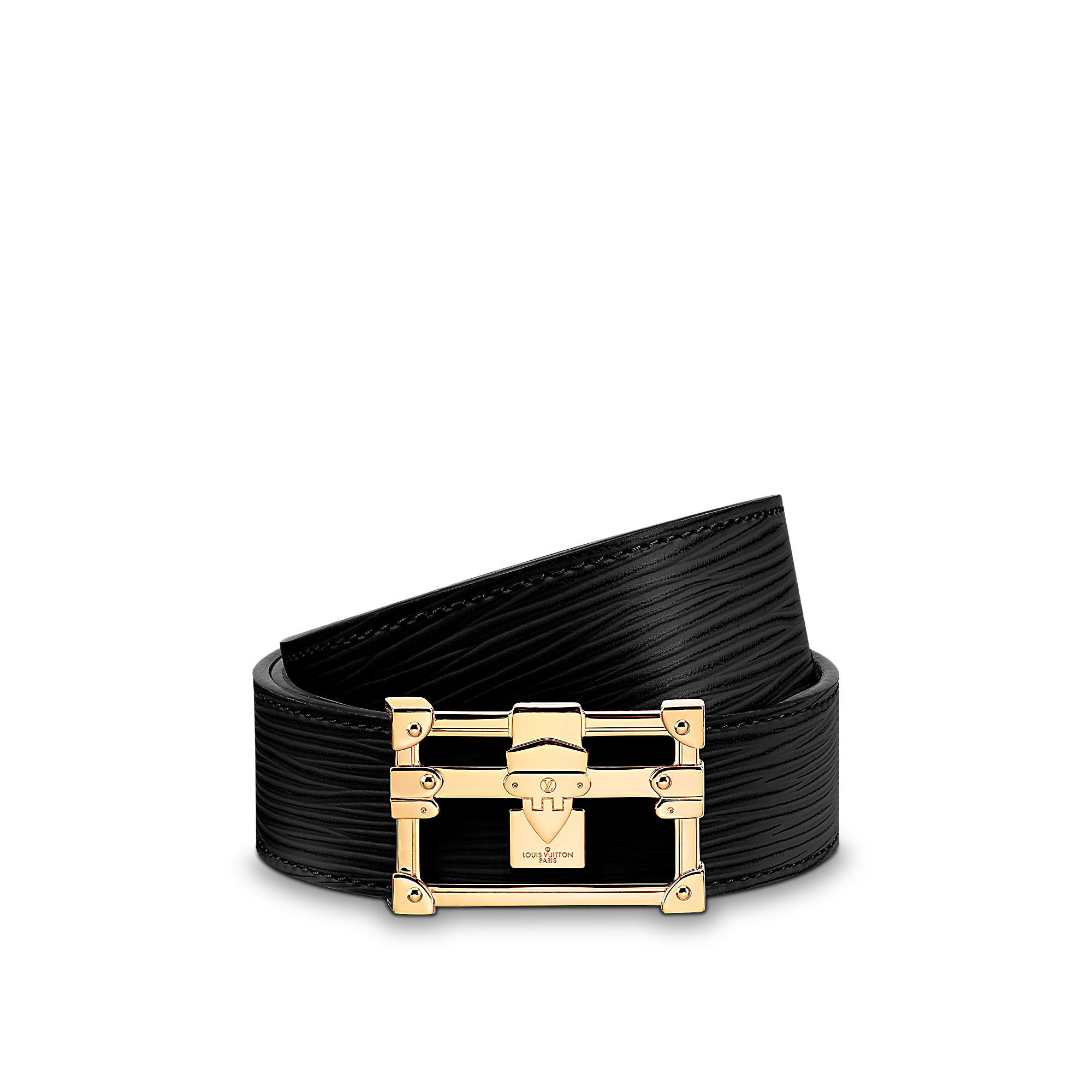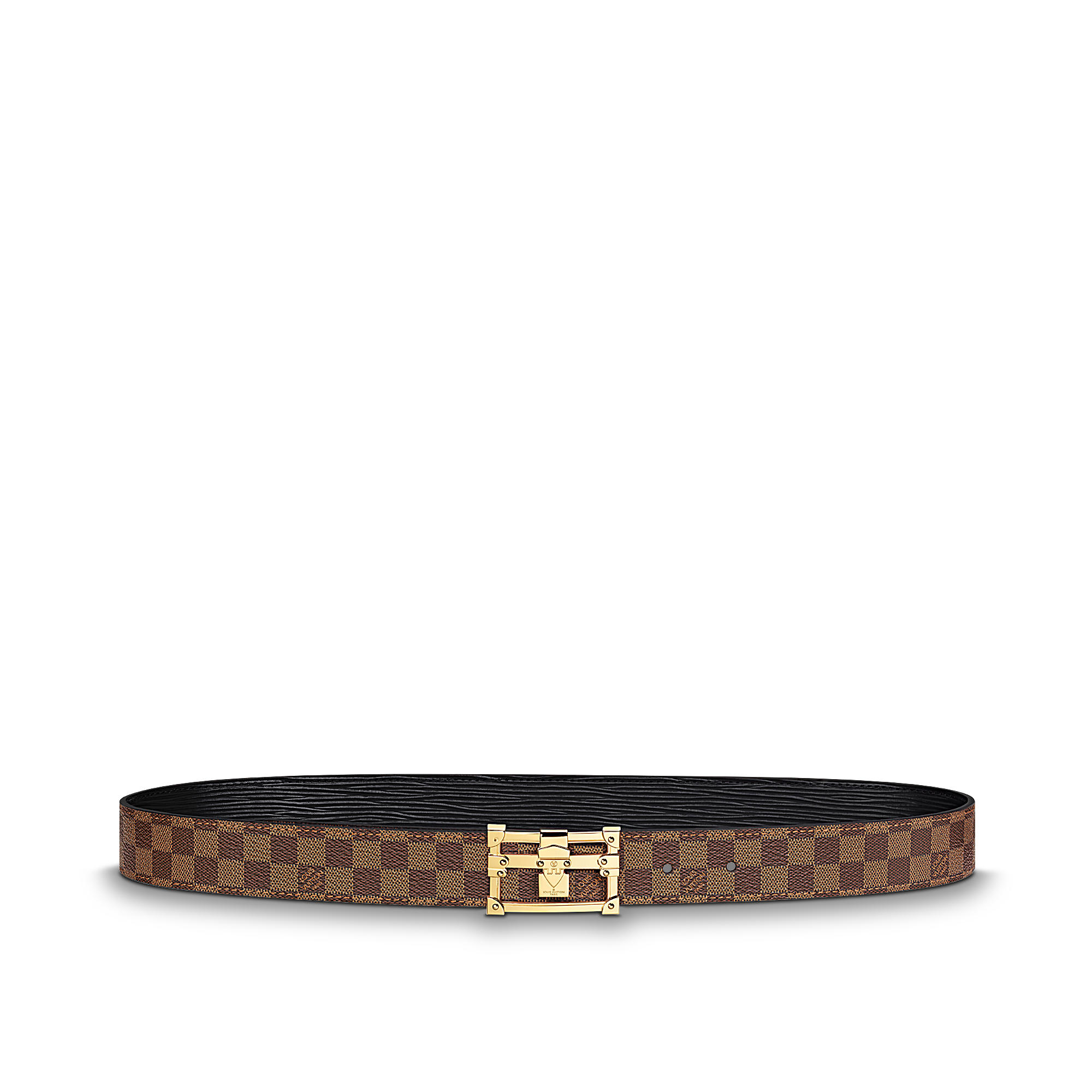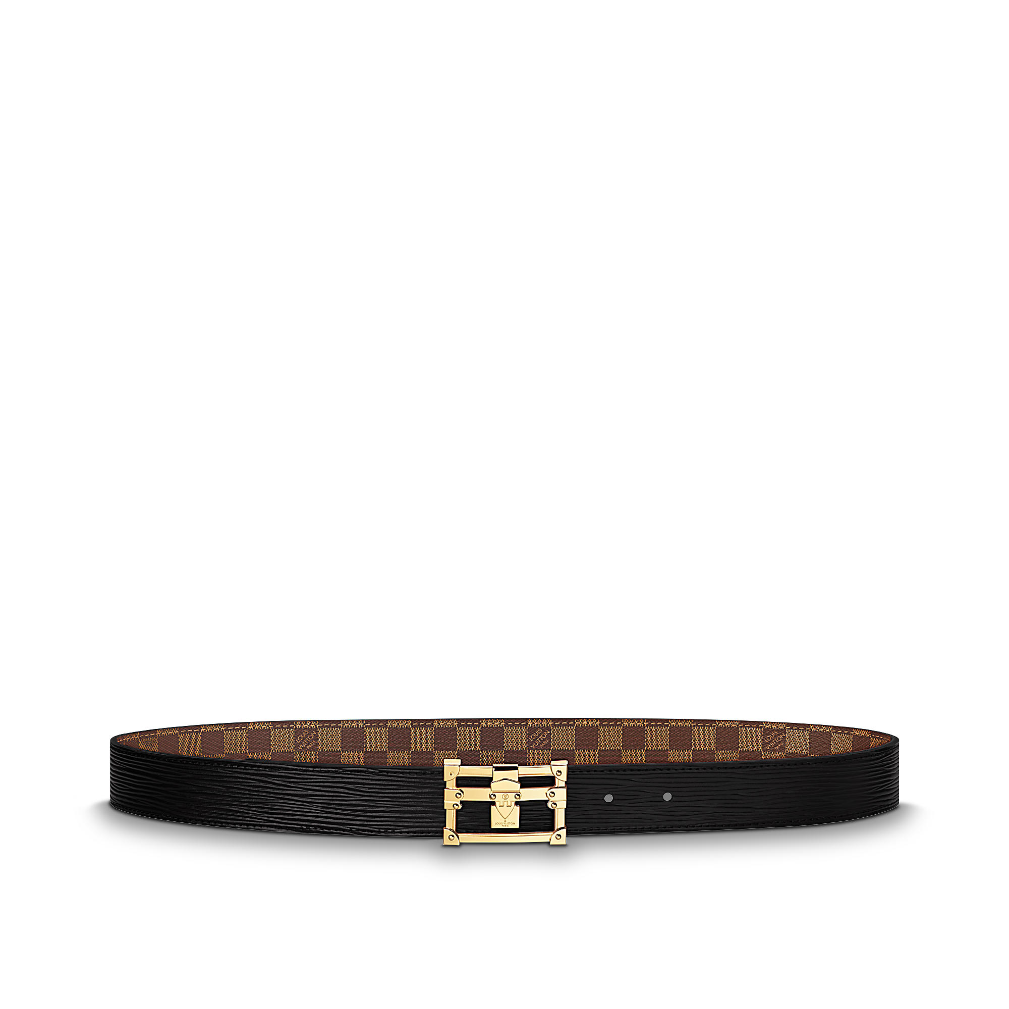 This reversible belt features a new plaque buckle designed in trompe l’oeil to evoke a real see-through Petite Malle. Timeless black Epi leather is complemented by Damier canvas for a strong fashion statement.