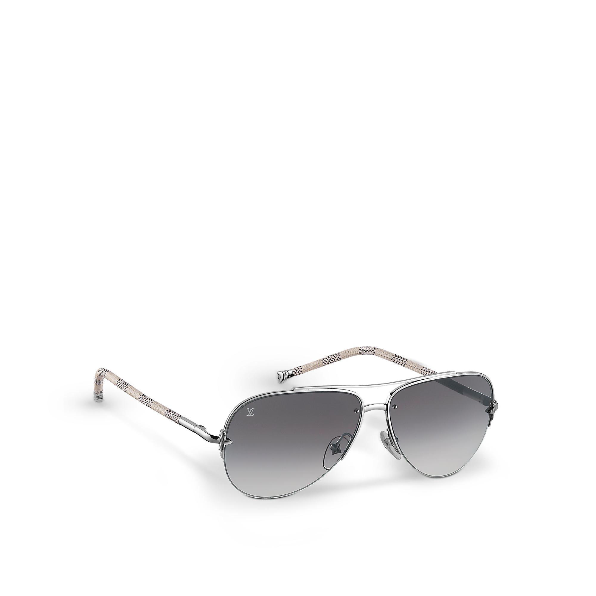 A smaller, feminine interpretation of the classic aviator shape, these stylish half-rimmed sunglasses feature a metal frame partially covered in Louis Vuitton’s iconic Monogram and Damier Azur canvases.