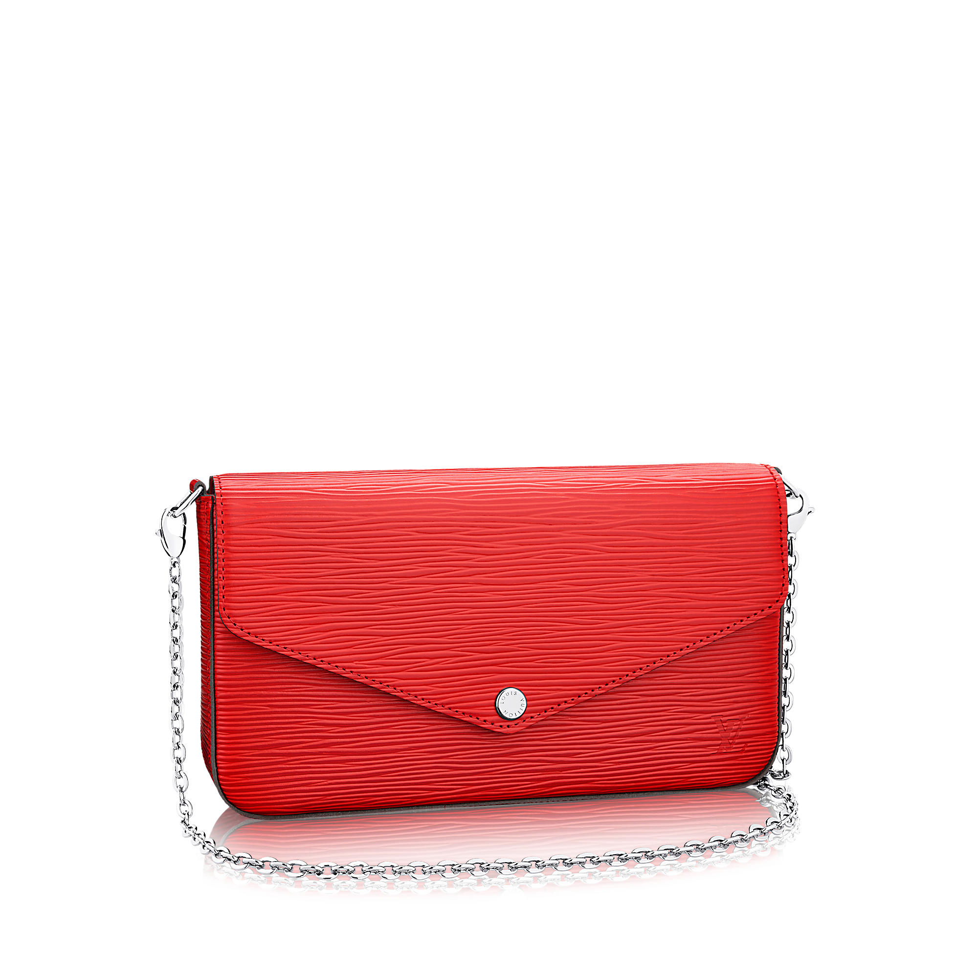 – Removable silver metallic chain for shoulder or cross-body carry
