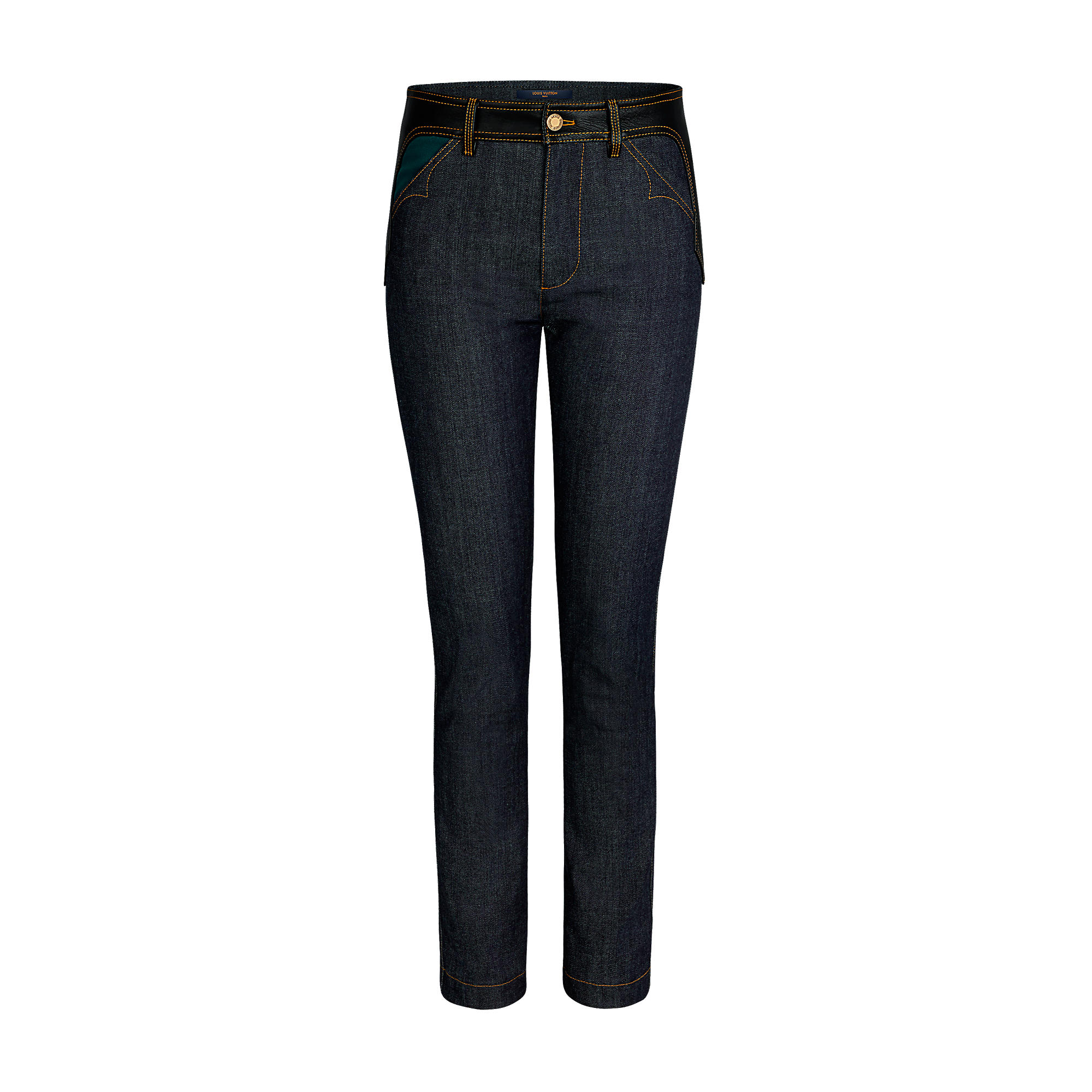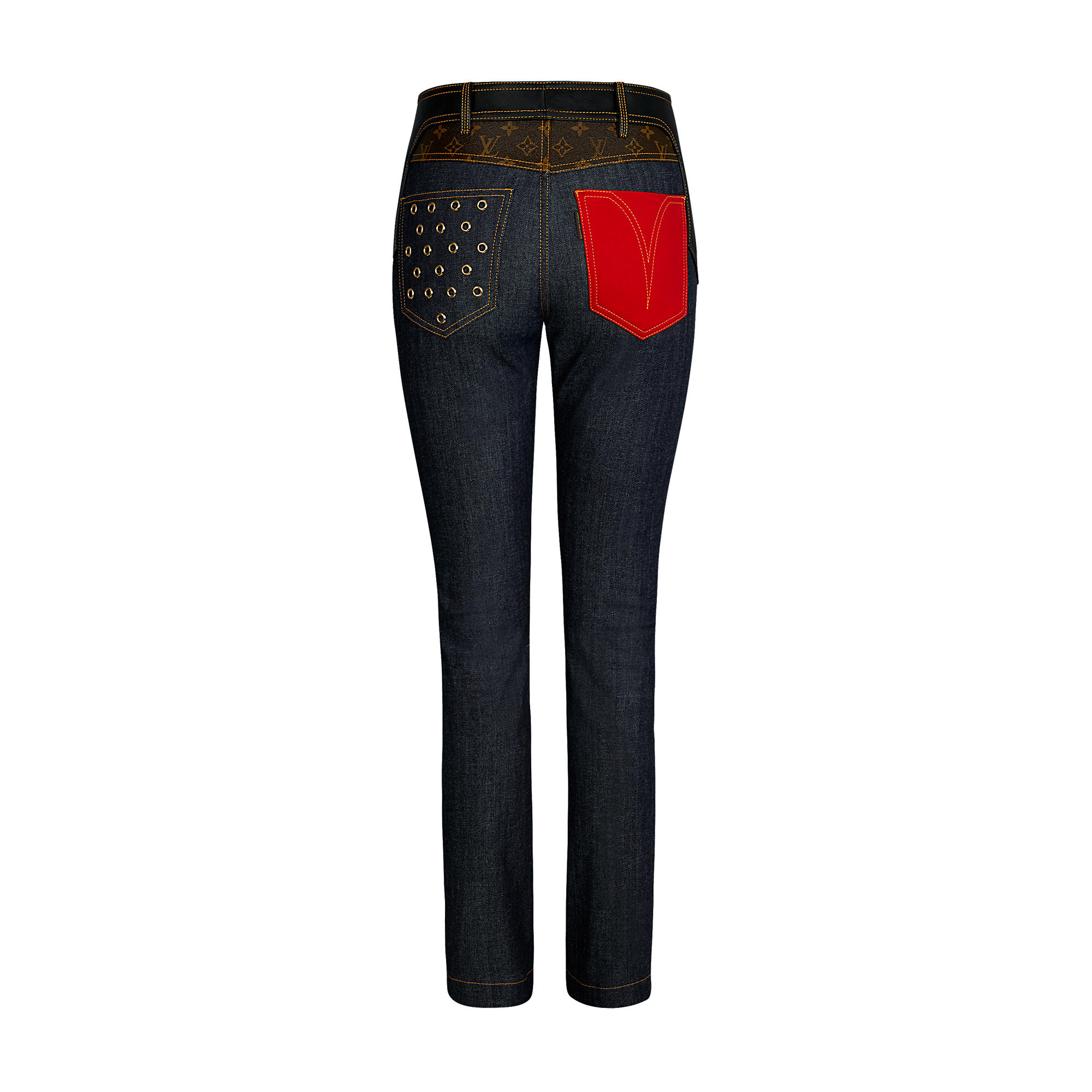 These slim denim pants are embroidered with details inspired by the leatherwork found on Louis Vuitton’s trunks. The Monogram canvas intarsia and eye-catching back pockets are signature details this season.