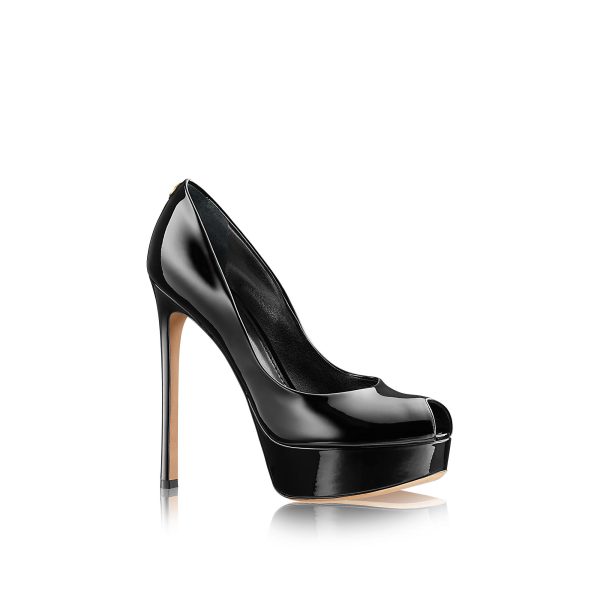 This platform pump in patent calf leather is distinguished by its clean lines, open toe and ultra-high stiletto heel. It is discreetly embellished at the back with a golden LV circle accessory.