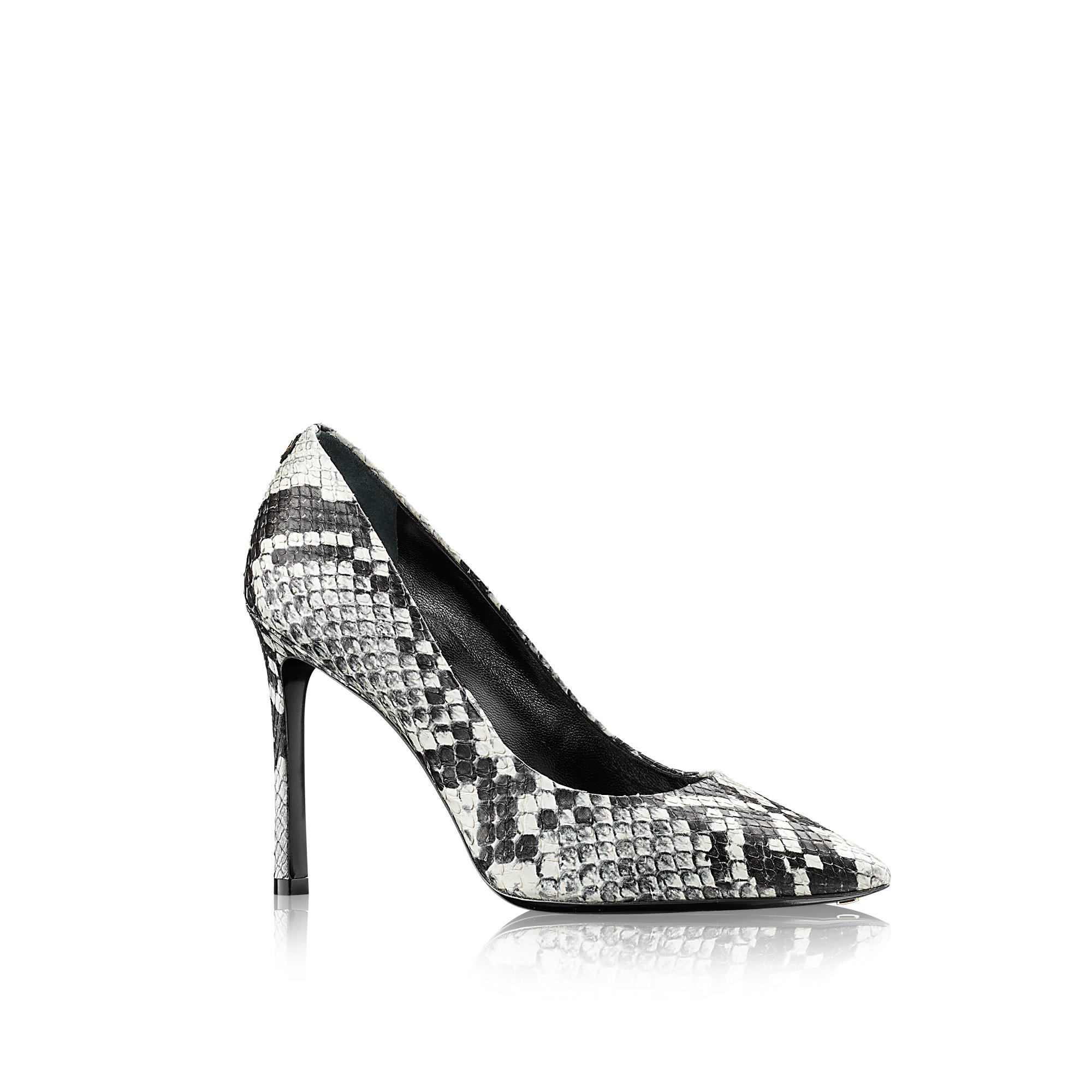 With its clean lines, pointed toe and slender stiletto heel, this pump in luxurious python leather is discreetly embellished at the back with a golden LV Circle accessory.