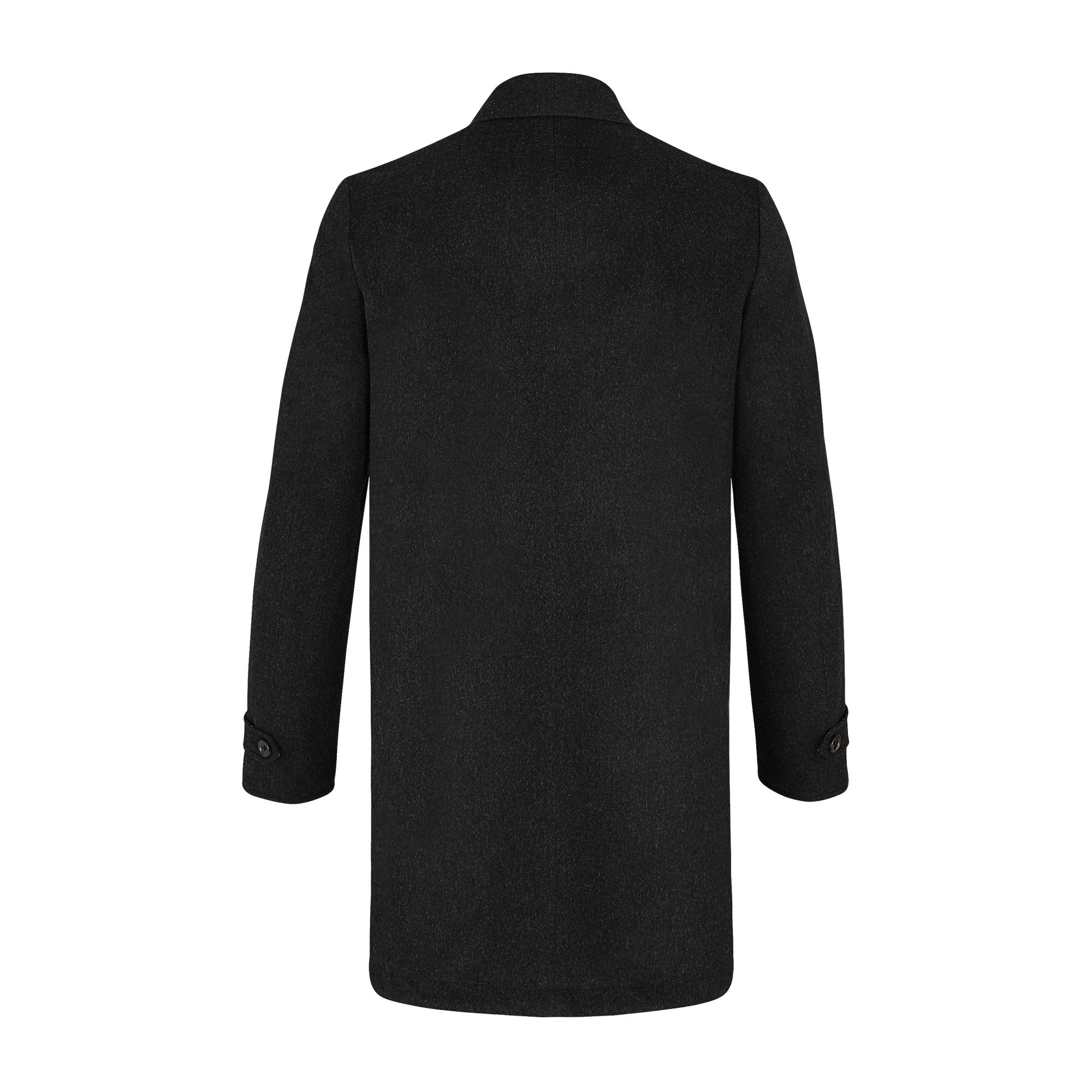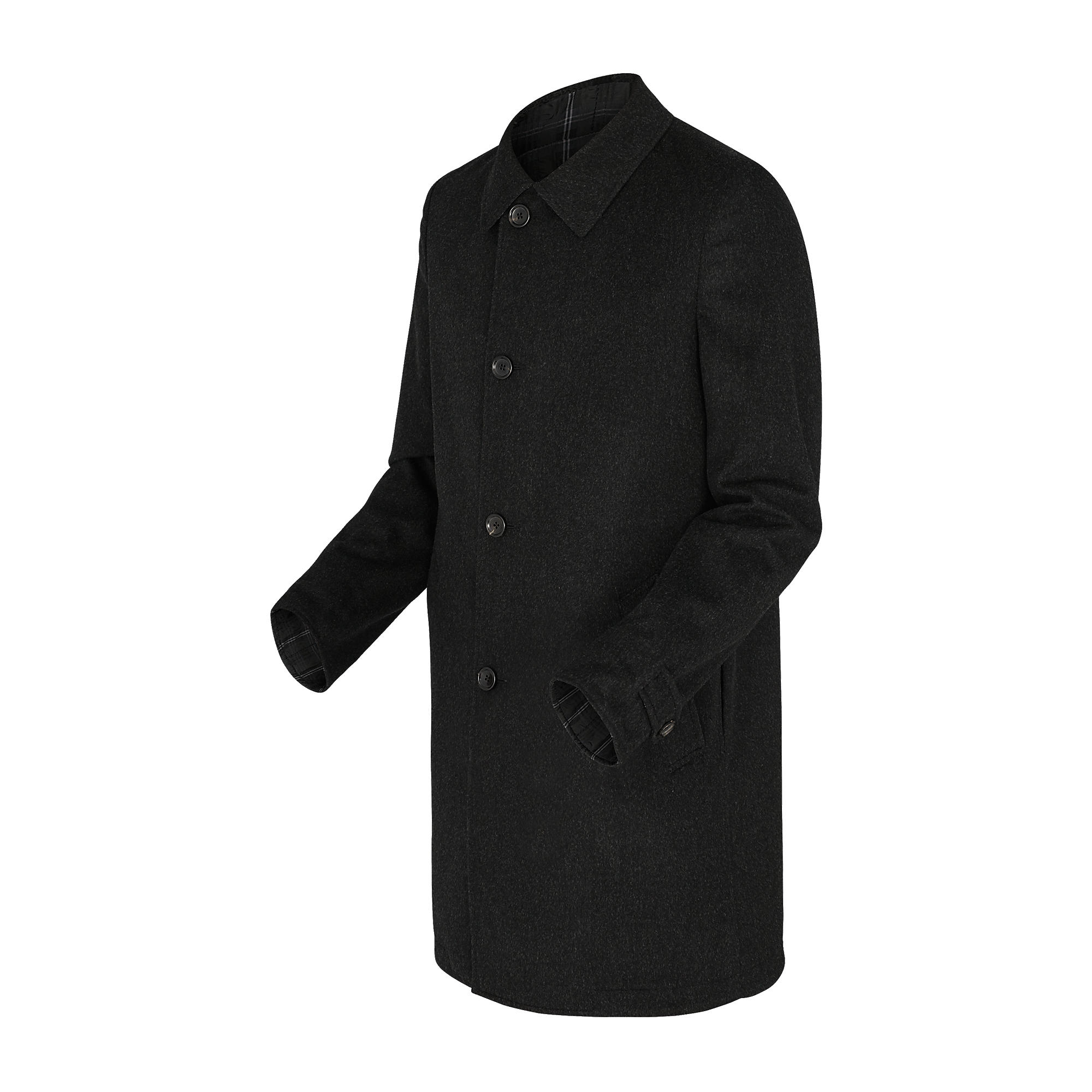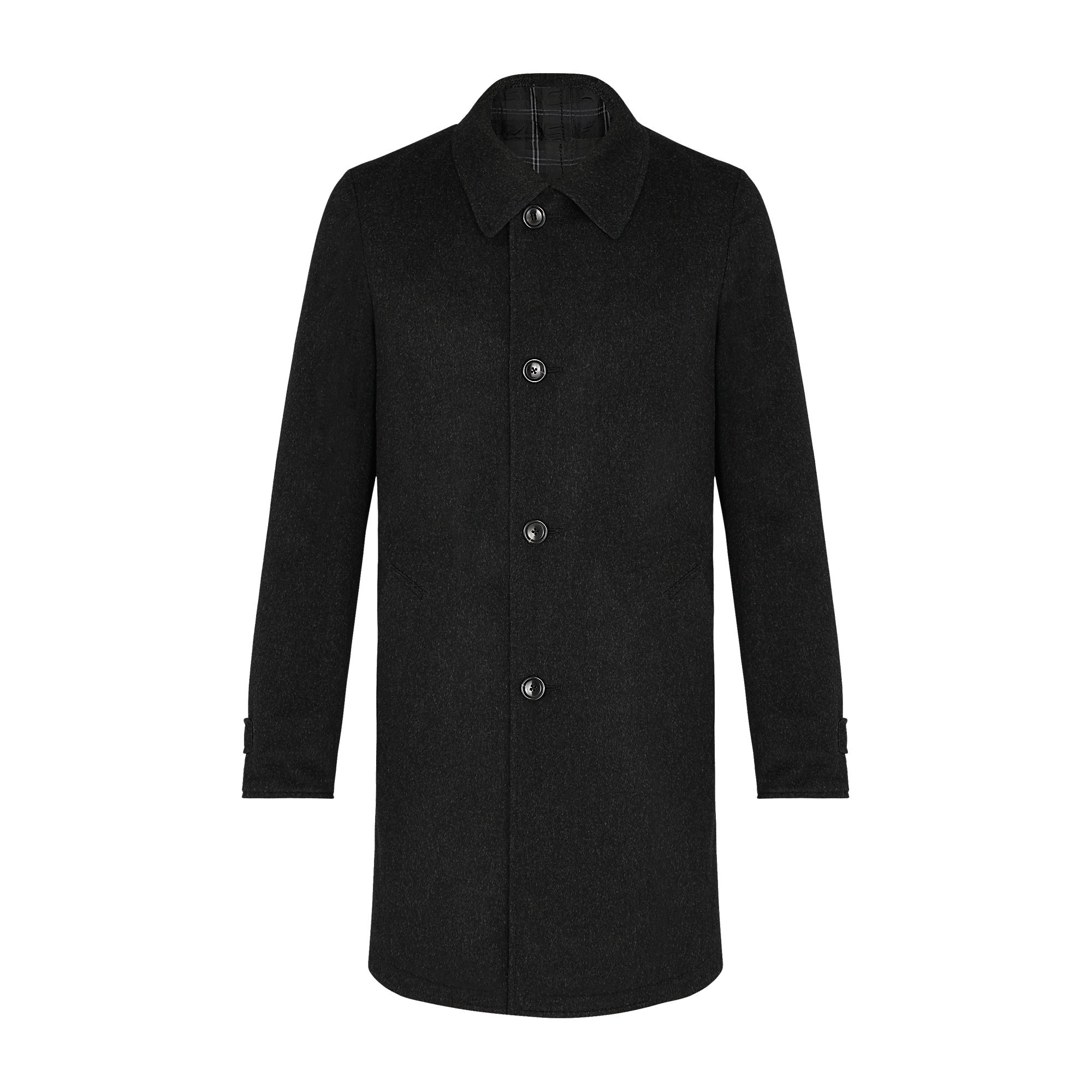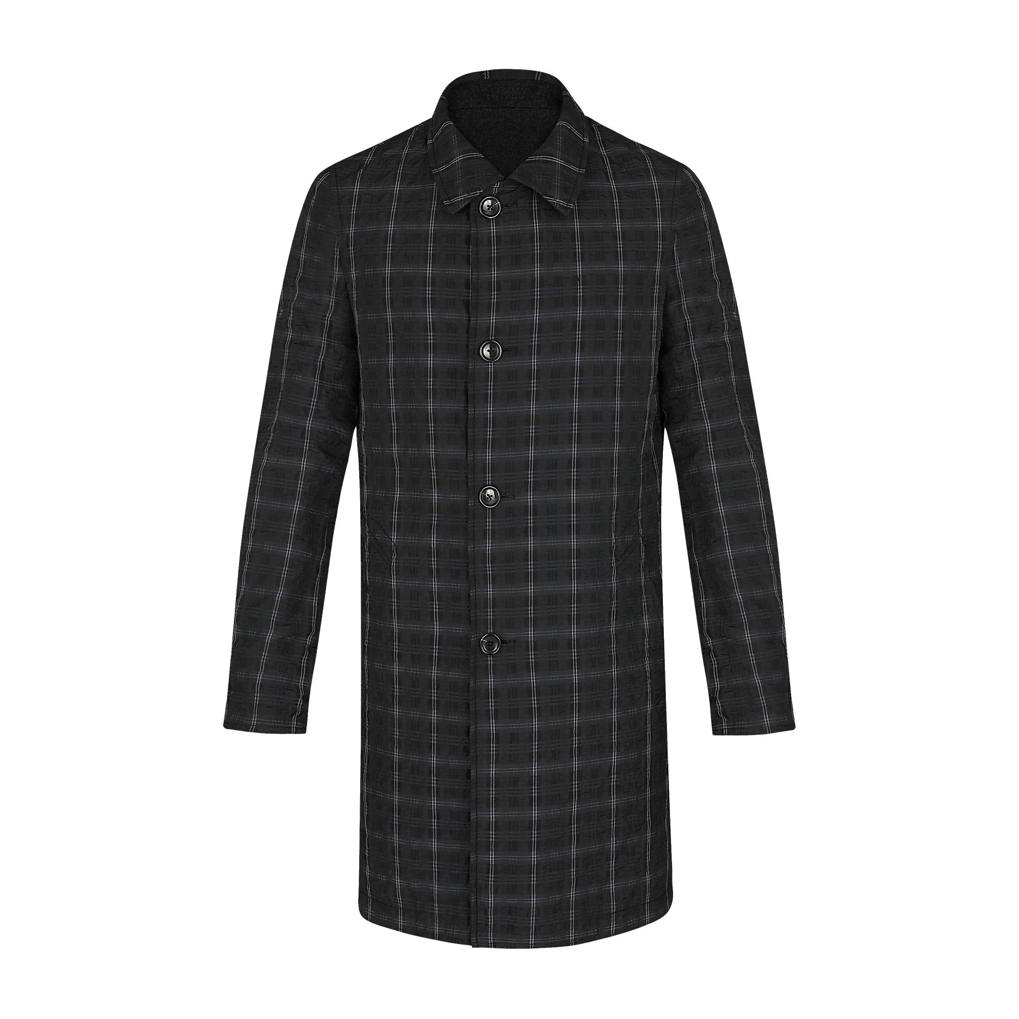 This versatile car coat offers both a classic business silhouette and a more casual look. Reversible, it features plain brushed wool on one side and checked technical seersucker on the other, both with the same cuff tab details.