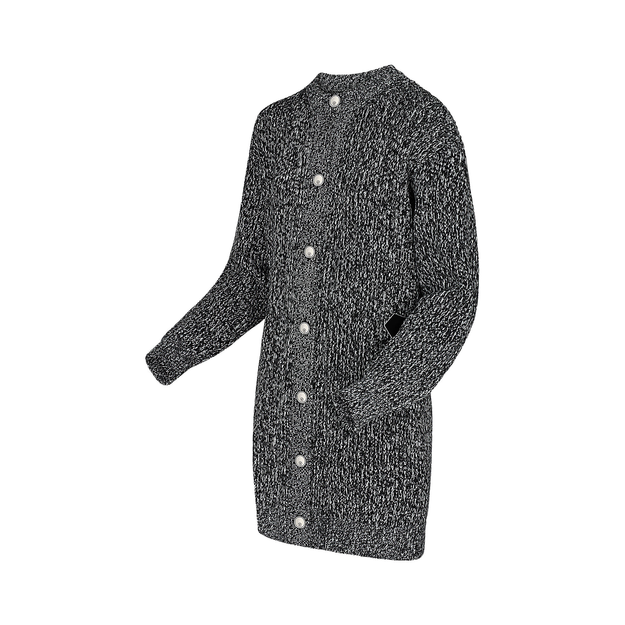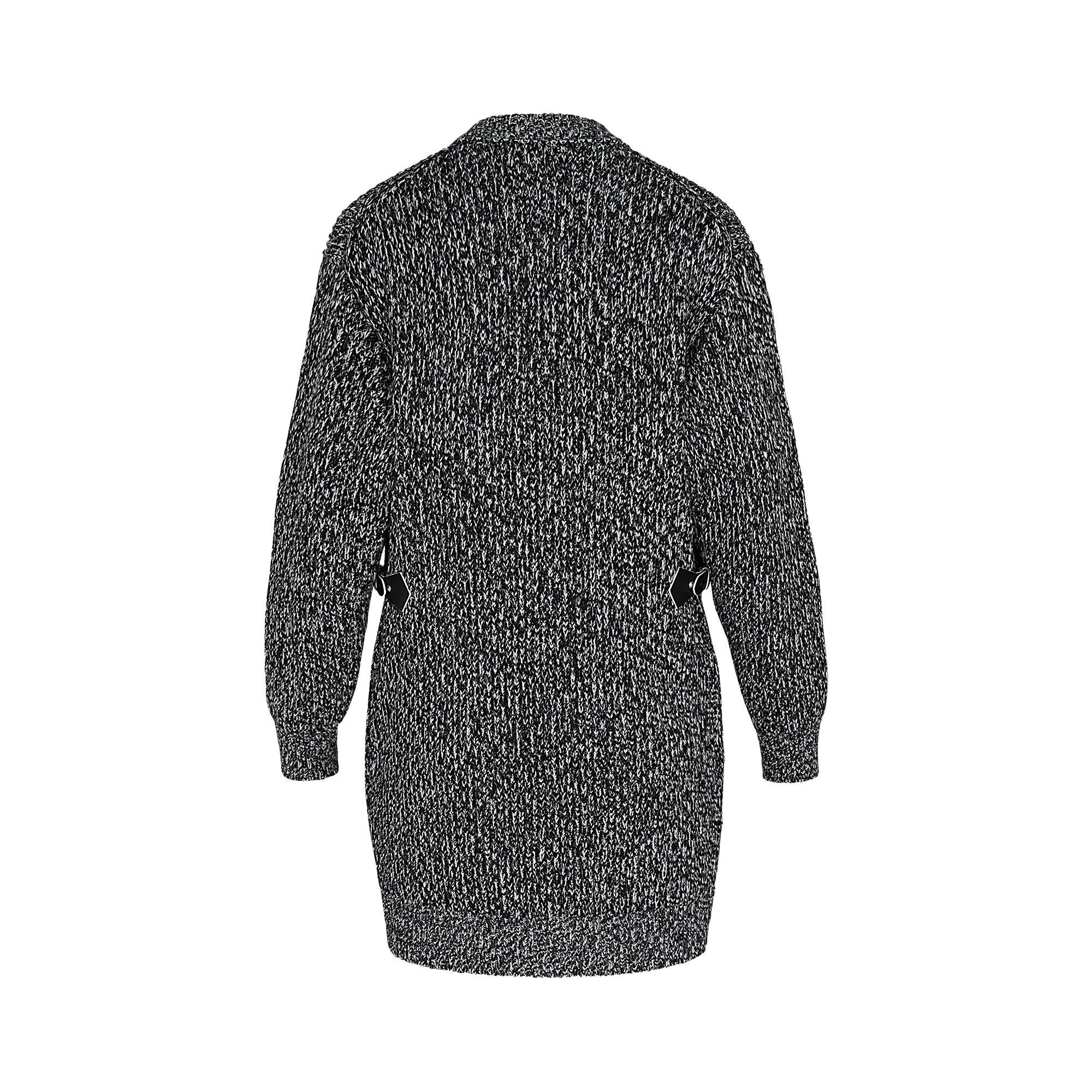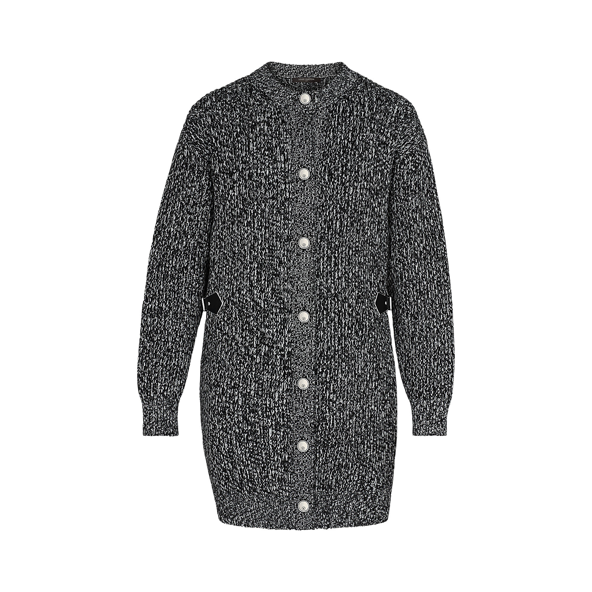 This long woolen cardigan features ribbing inspired by outerwear and an oversized cut. The waistline is emphasised by black leather adjusters, inspired by the handles of iconic Louis Vuitton trunks.