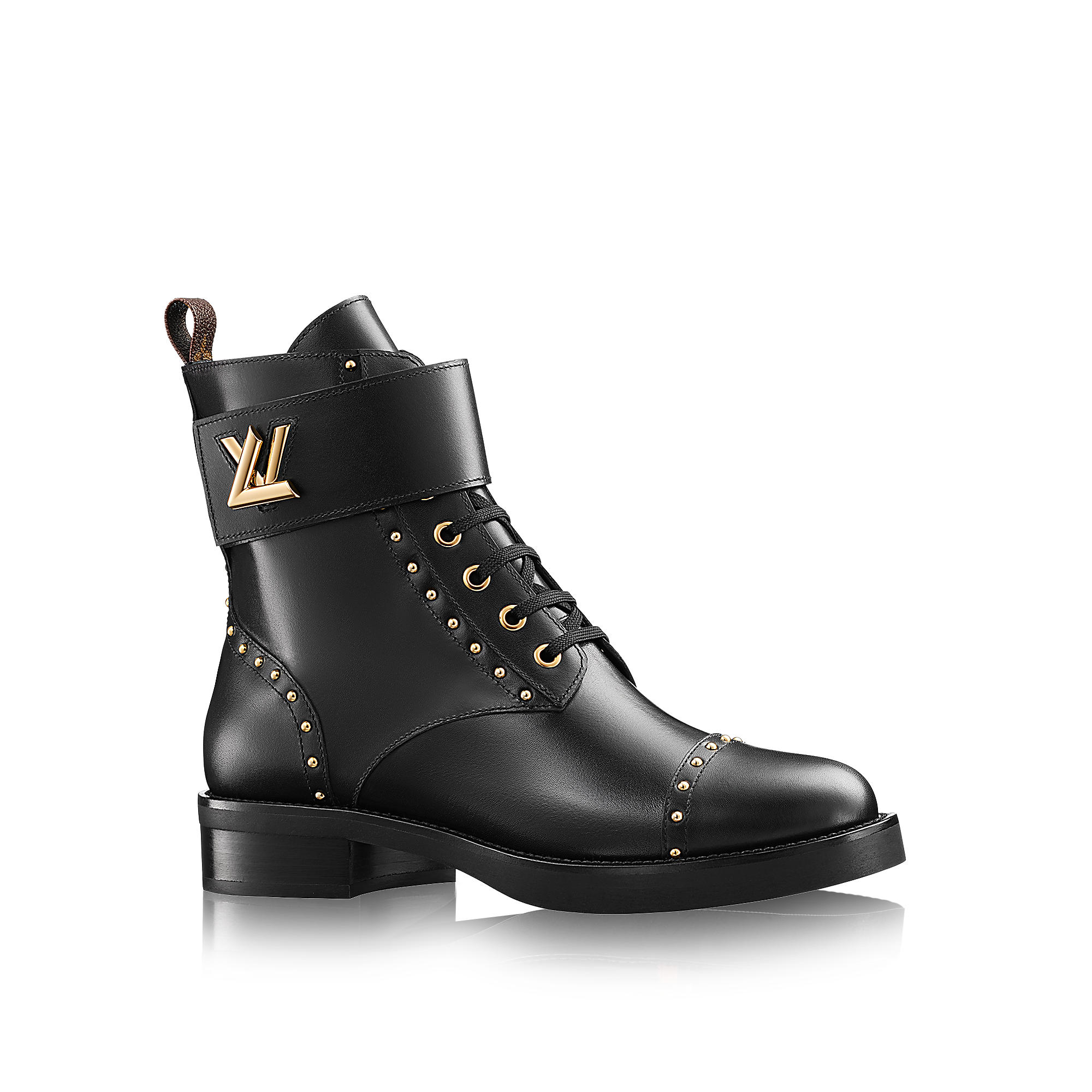 Achieving a perfect balance between classic and edgy, this ankle boot is decorated with tiny golden studs highlighting the stitching, and signed with an iconic LV Twist accessory.