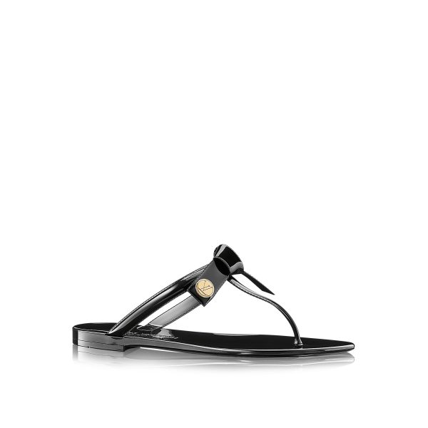 A must-pack for any vacation, this stylish thong in high-shine waterproof rubber is embellished with a feminine bow and LV-engraved button.