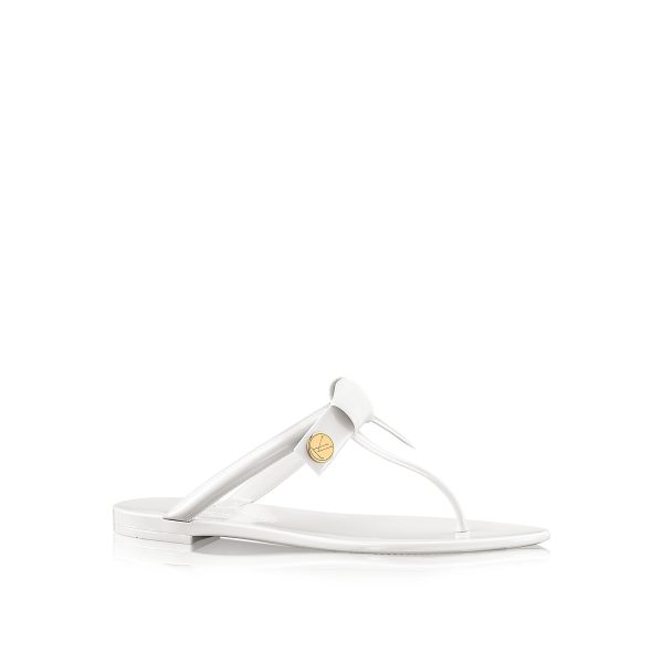 A must-pack for any vacation, this stylish thong in high-shine waterproof rubber is embellished with a feminine bow and LV-engraved button.