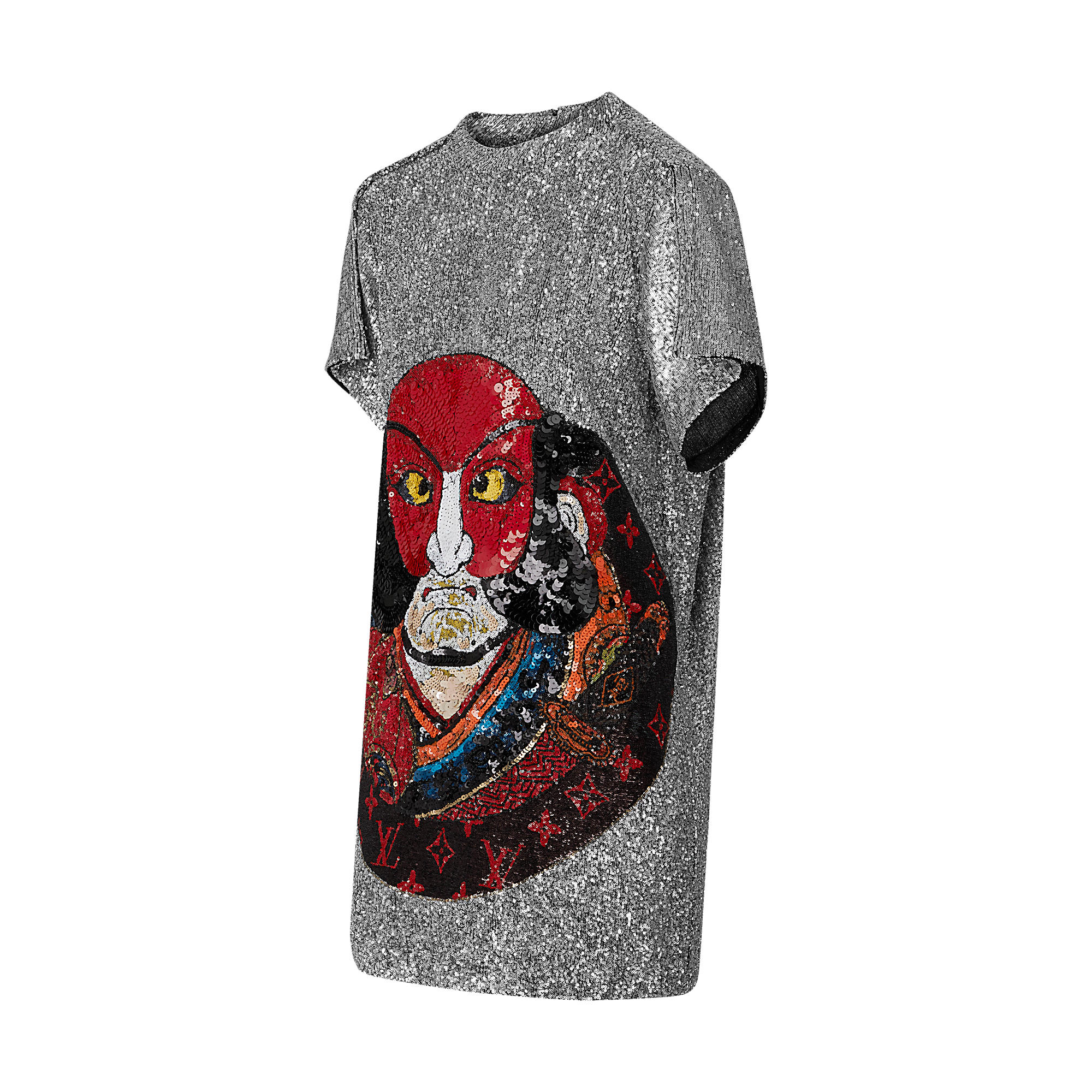 Totally embroidered with sequins, this striking dress displays a Kabuki mask and integrated LV Monogram by designer Kansai Yamamoto, a play on the collection’s Japanese theme. Straight cut, it features the loose fit that is one of the season’s signatures.
