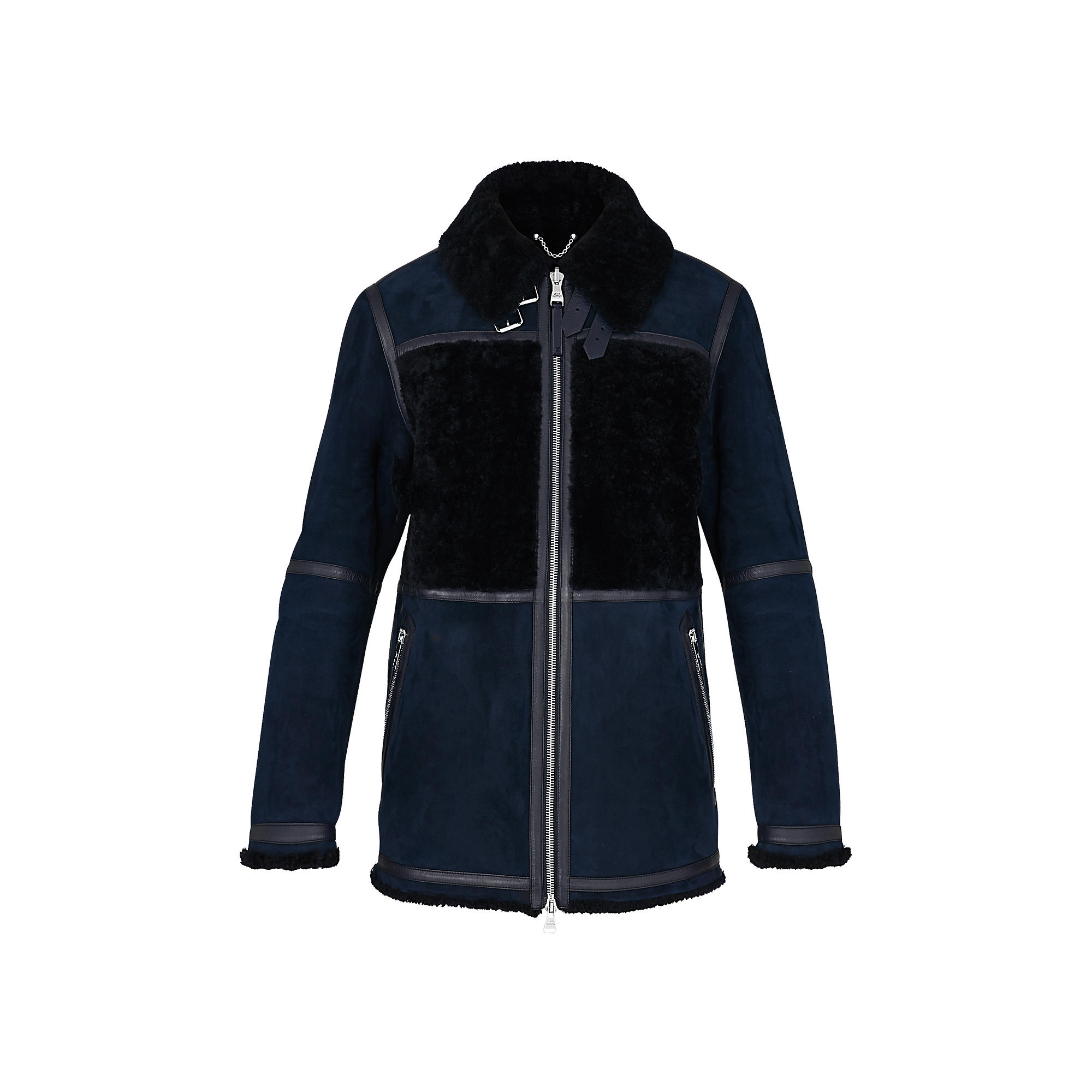 This warm aviator shearling blouson is one of this season’s most luxurious pieces. Both sides of the shearling are juxtaposed to add texture, accentuated by a calfskin band on the center-front, cuffs and seams.
