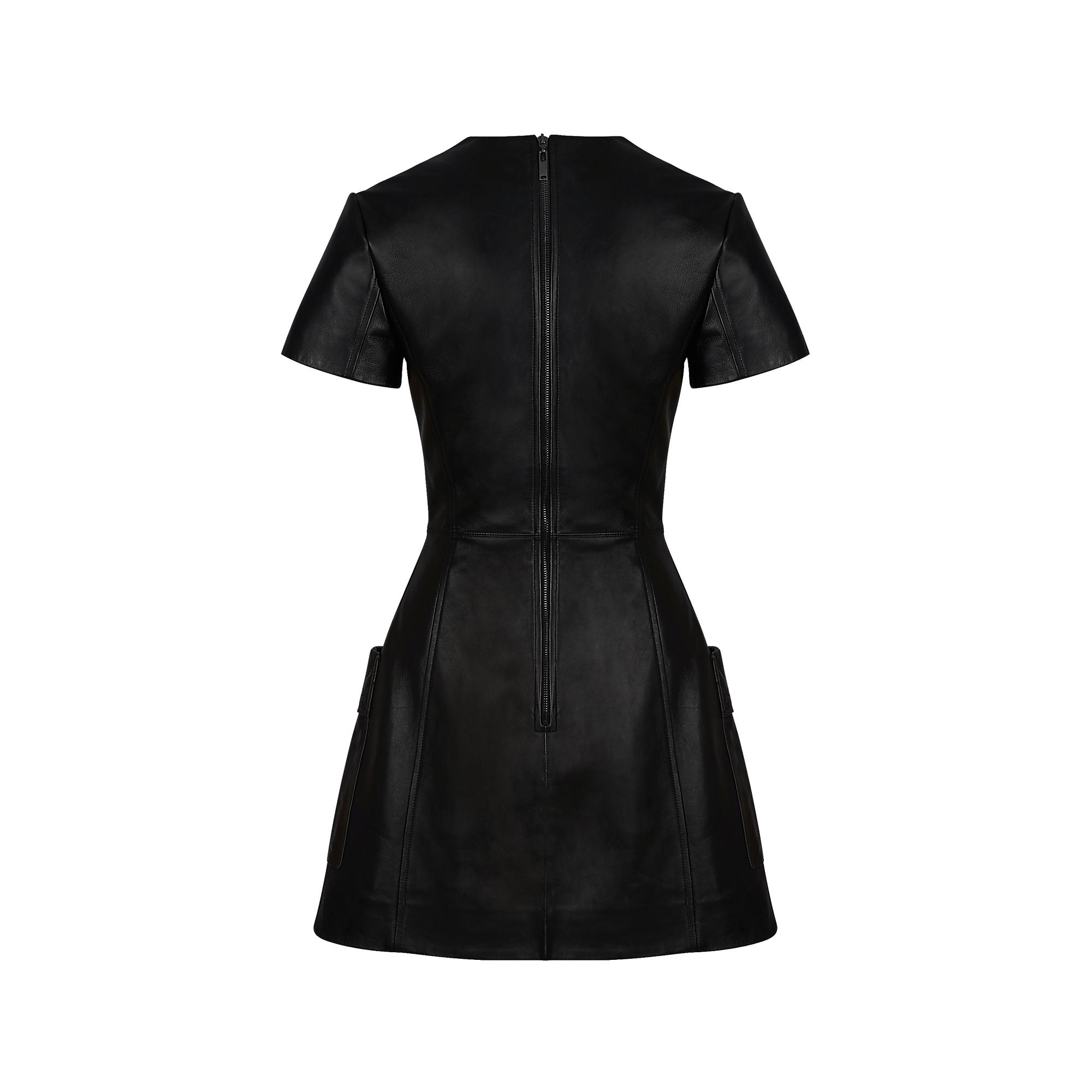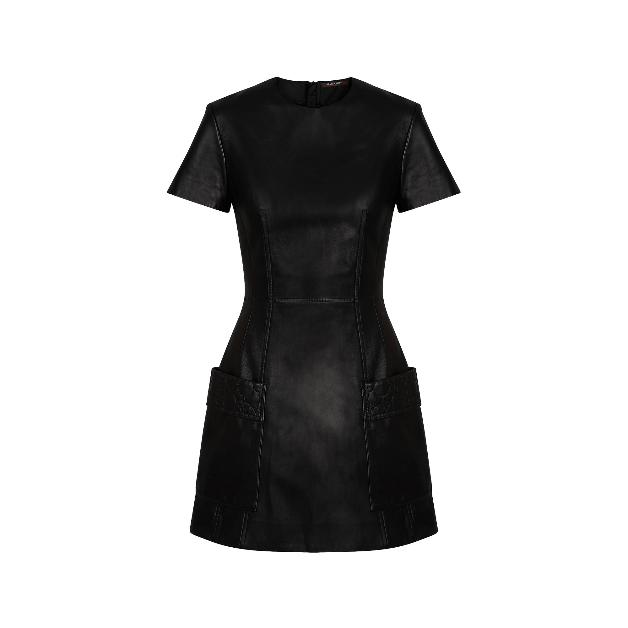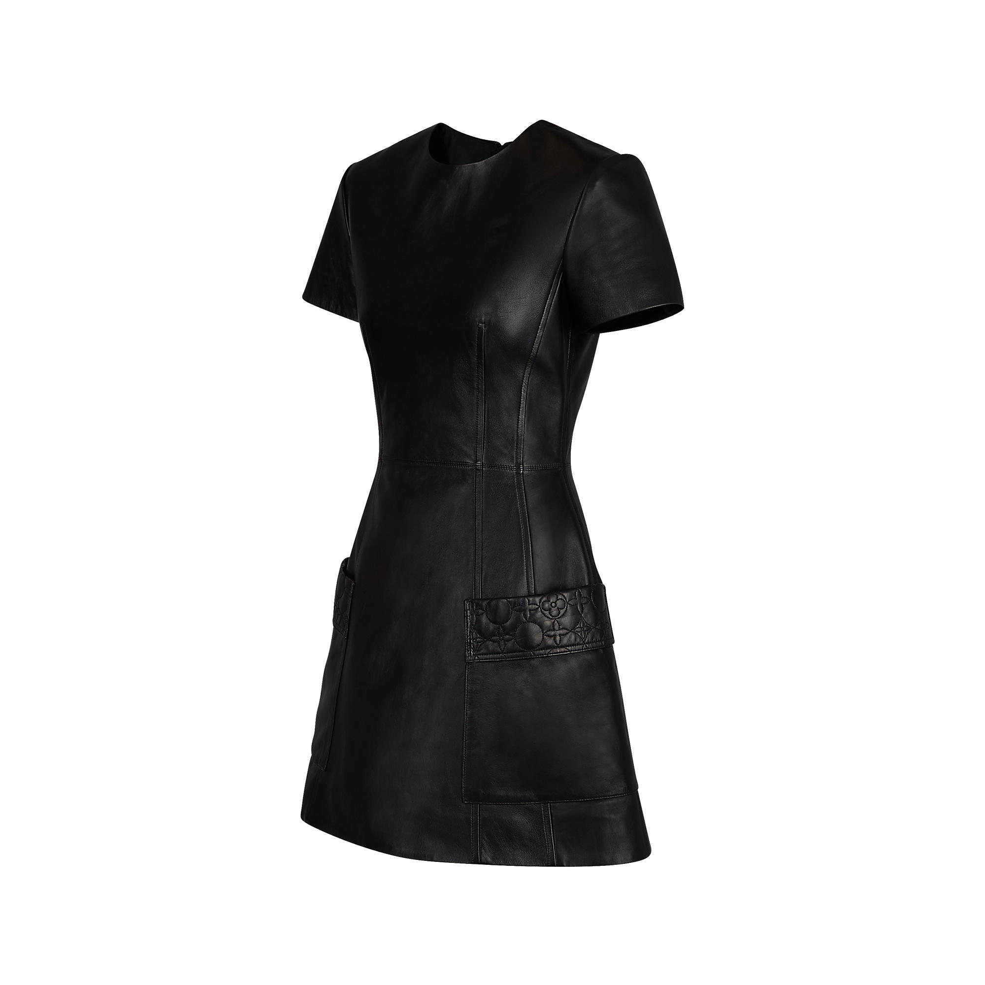Quilted Monogram flowers on the pockets of this shiny lambskin minidress create a new 3D signature effect, also present in the season’s leather goods collection. The sleeves are short, and the dress closes with a long black contrasting zipper in the back.
