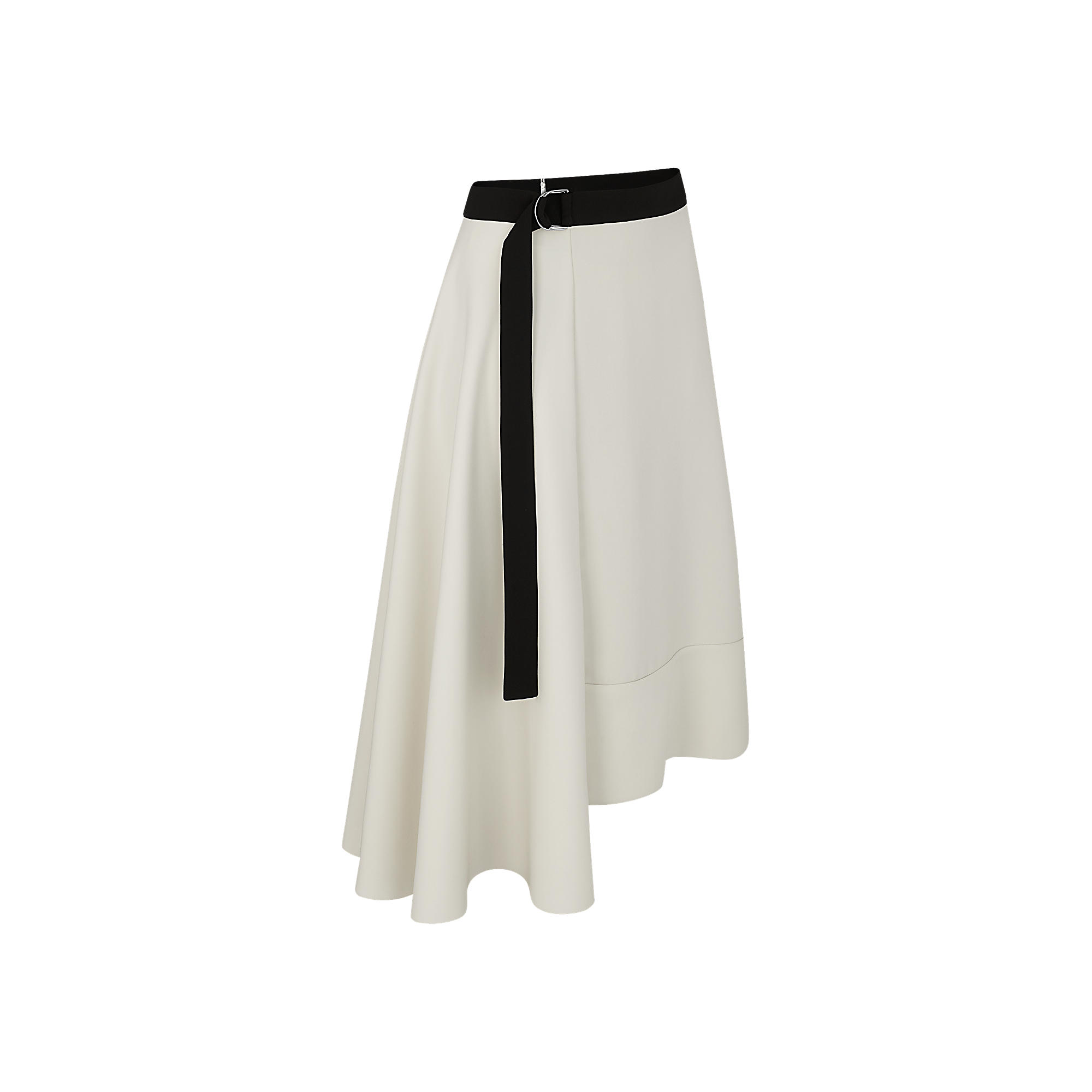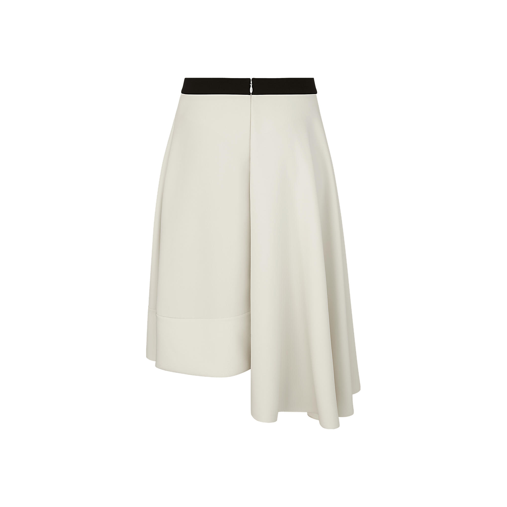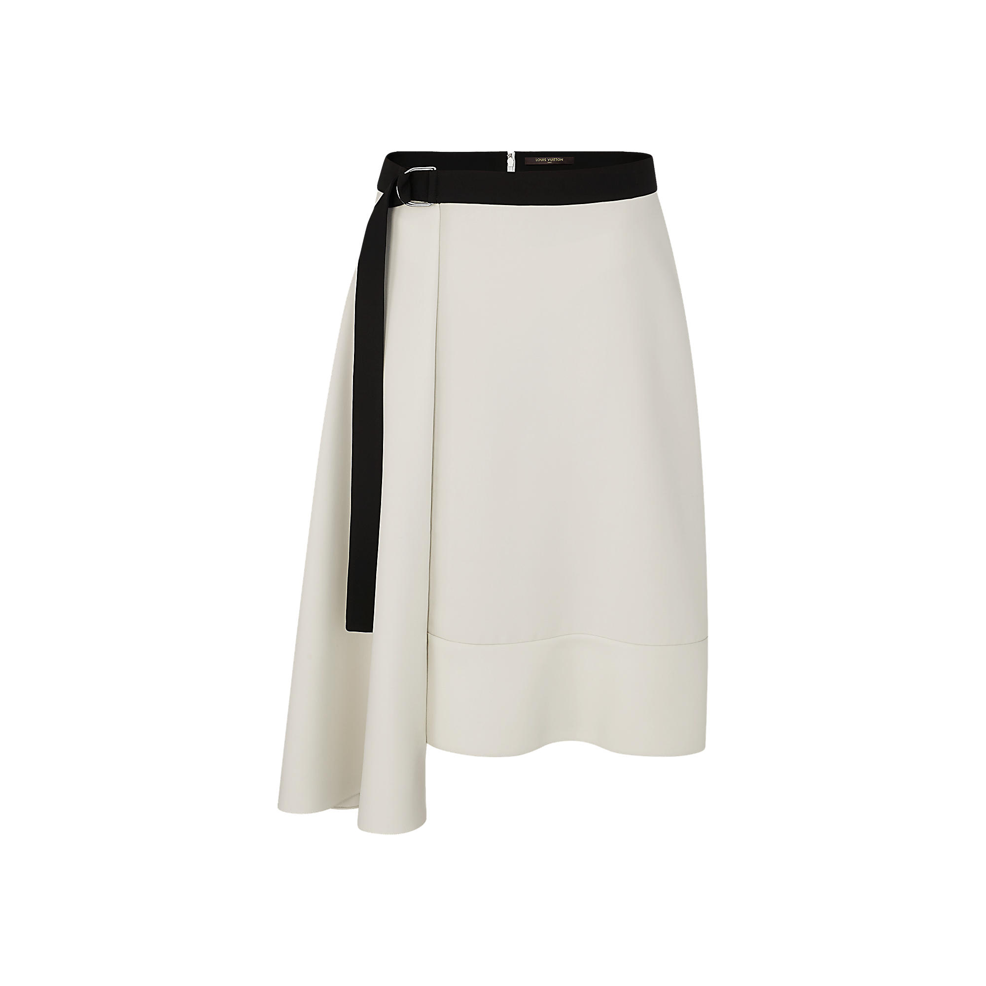 Tailored from silk cady for a fluid and feminine effect, this knee-length skirt features a loose-fitting asymmetric cut. The contrasting belt fastens with a double D-ring, one of this season’s signature details.