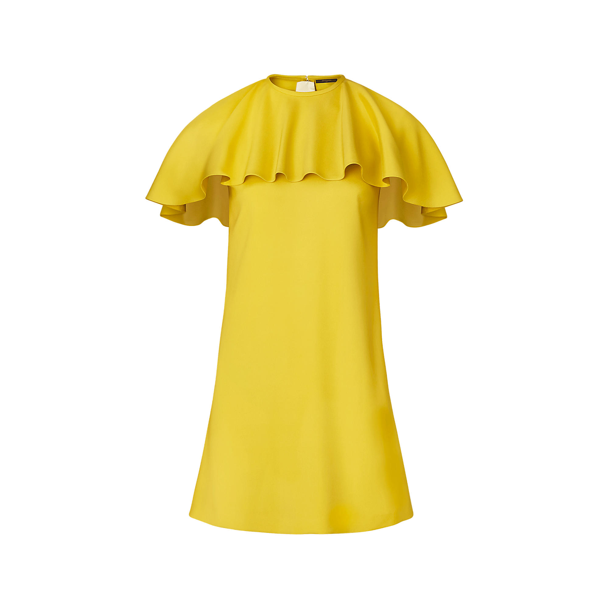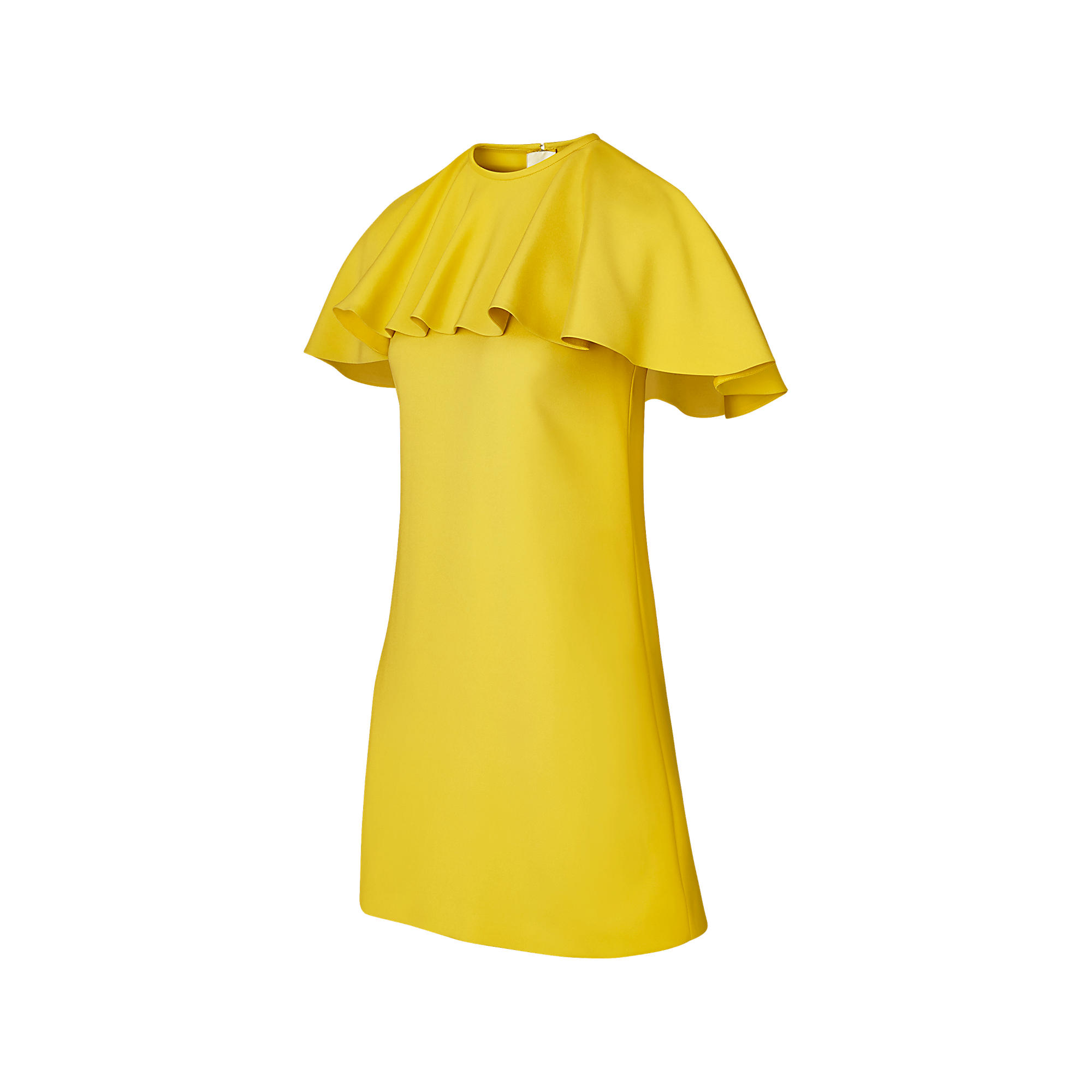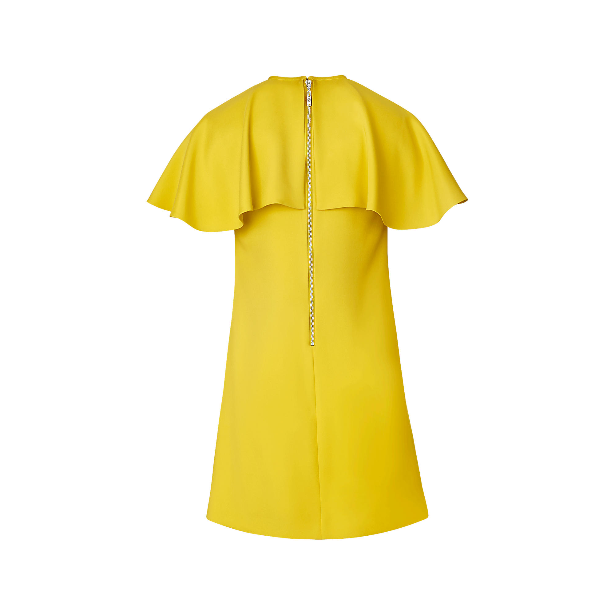 Inspired by the futuristic sci-fi fashions of the late 60s and early 70s, this short A-line dress continues the collection’s cape theme with its dramatic feminine ruffle. Its silk cady fabric has a touch of stretch, making it supremely comfortable to wear.