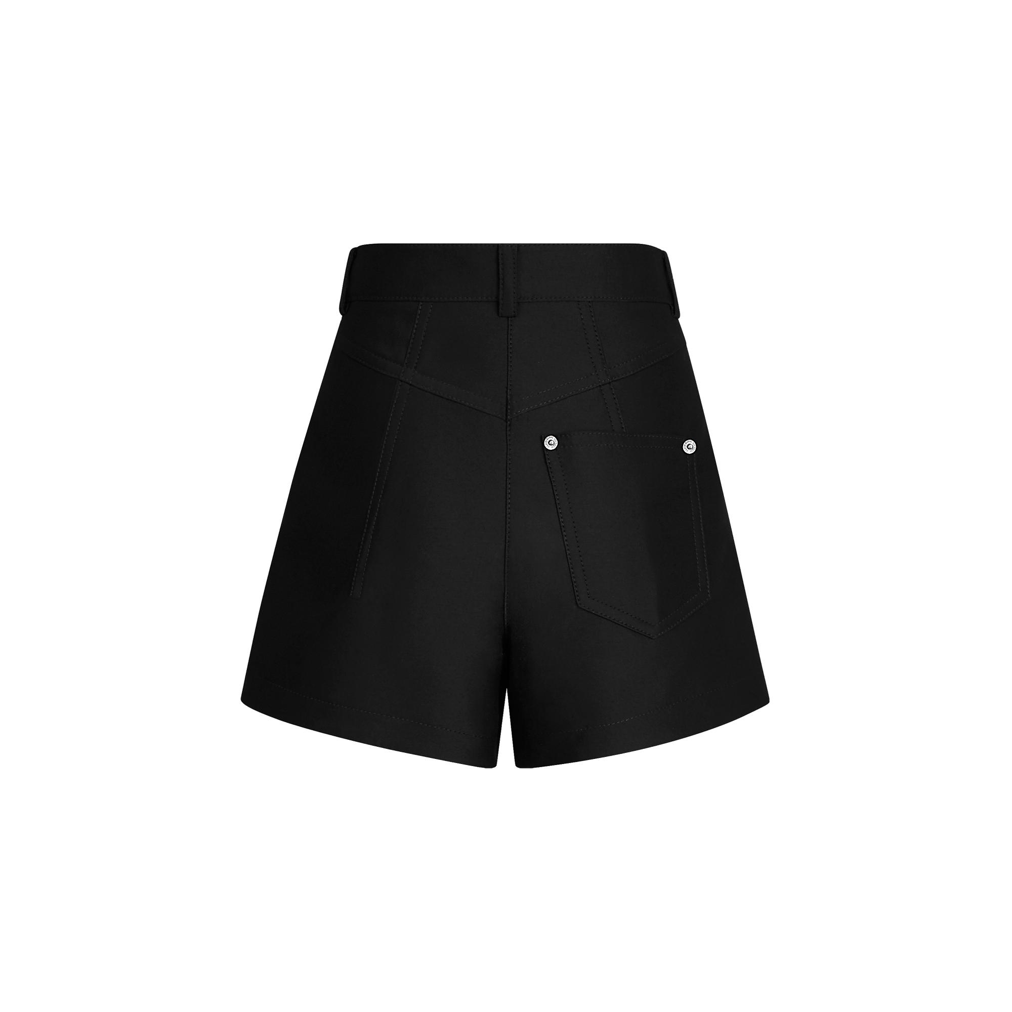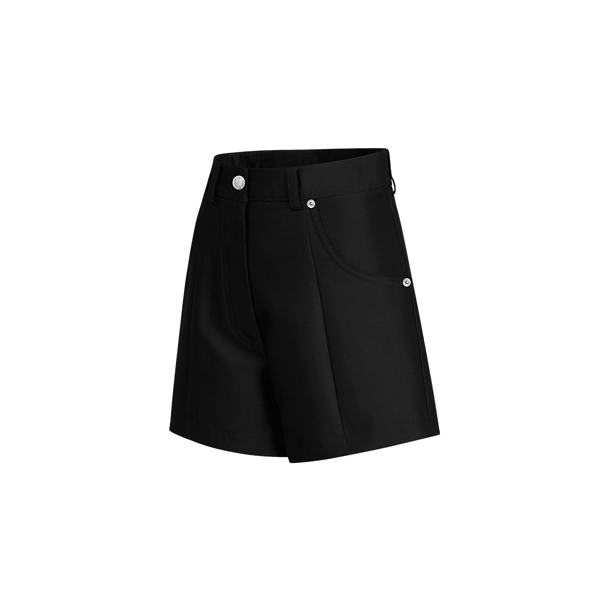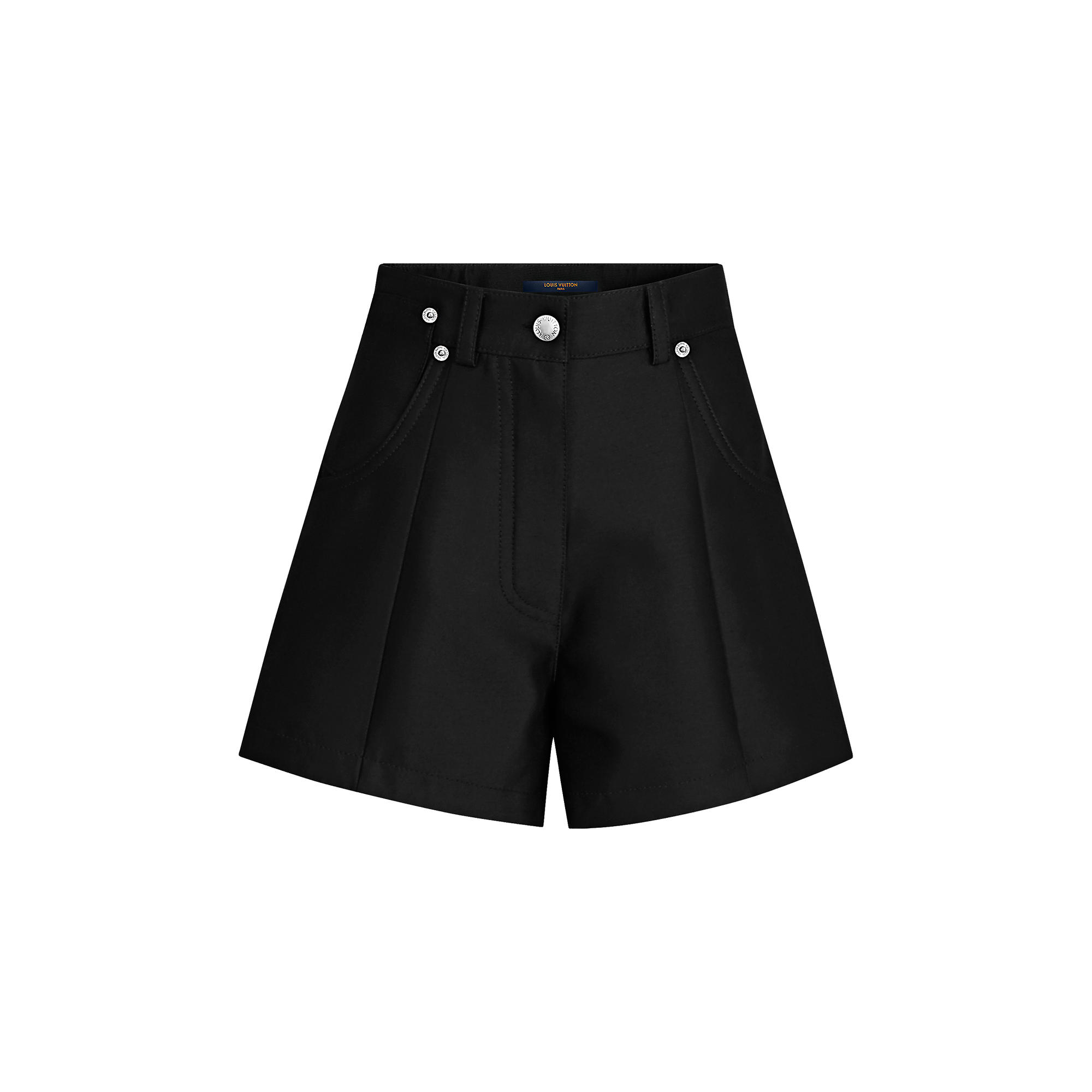 Crafted from a thick, slightly shiny silk wool radzimir with a signature silver LV button, these 5 pocket shorts flatter the figure with their high waist. A wardrobe essential, they can be worn with a long shirt as seen in the show, or with an embroidered jersey for a day to evening look.