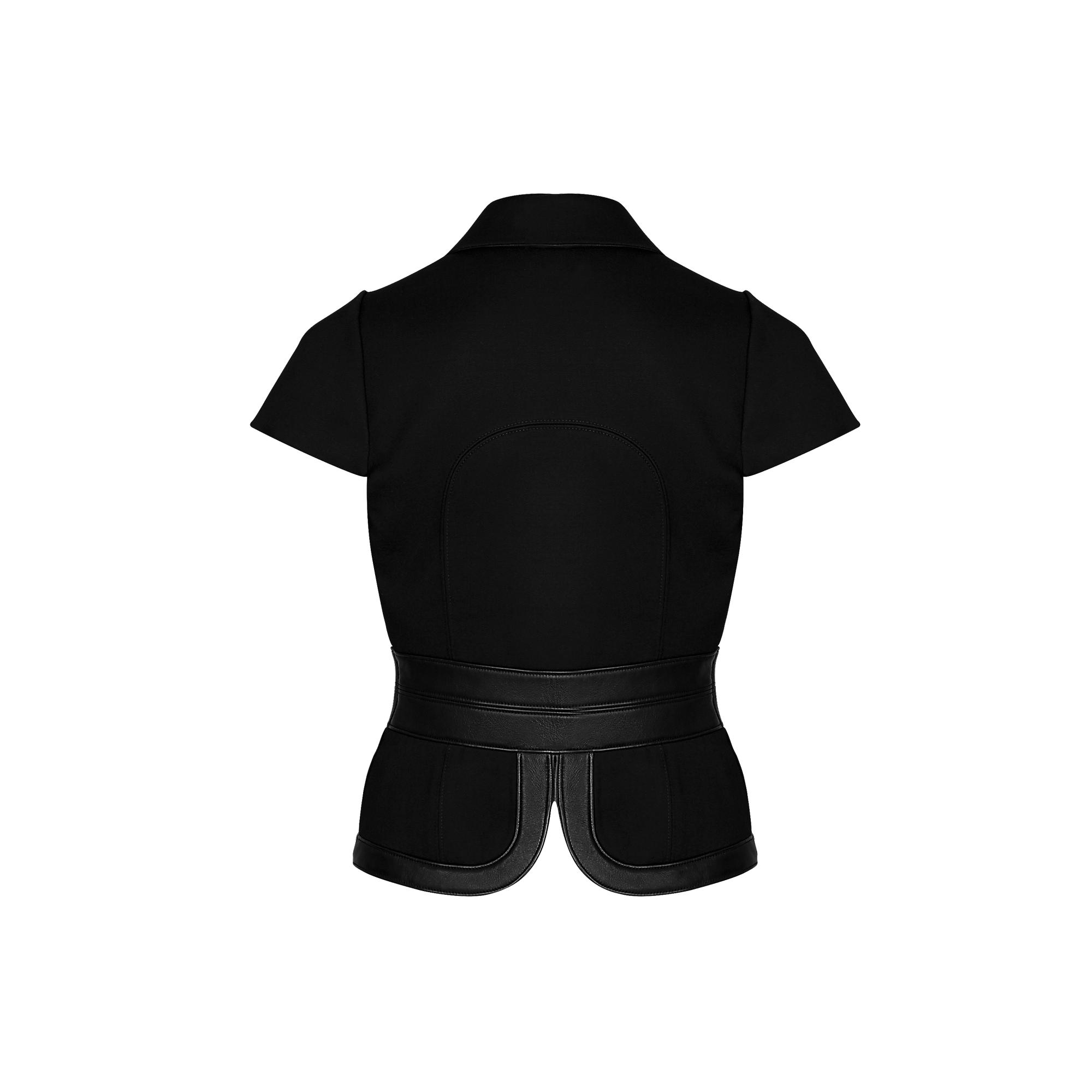 Crafted from form-fitting stretch wool, this short-sleeved jacket features a leather belt to highlight the waistline and create a highly feminine silhouette. Closed using the season’s emblematic studded leather palm and a signature LV snap.