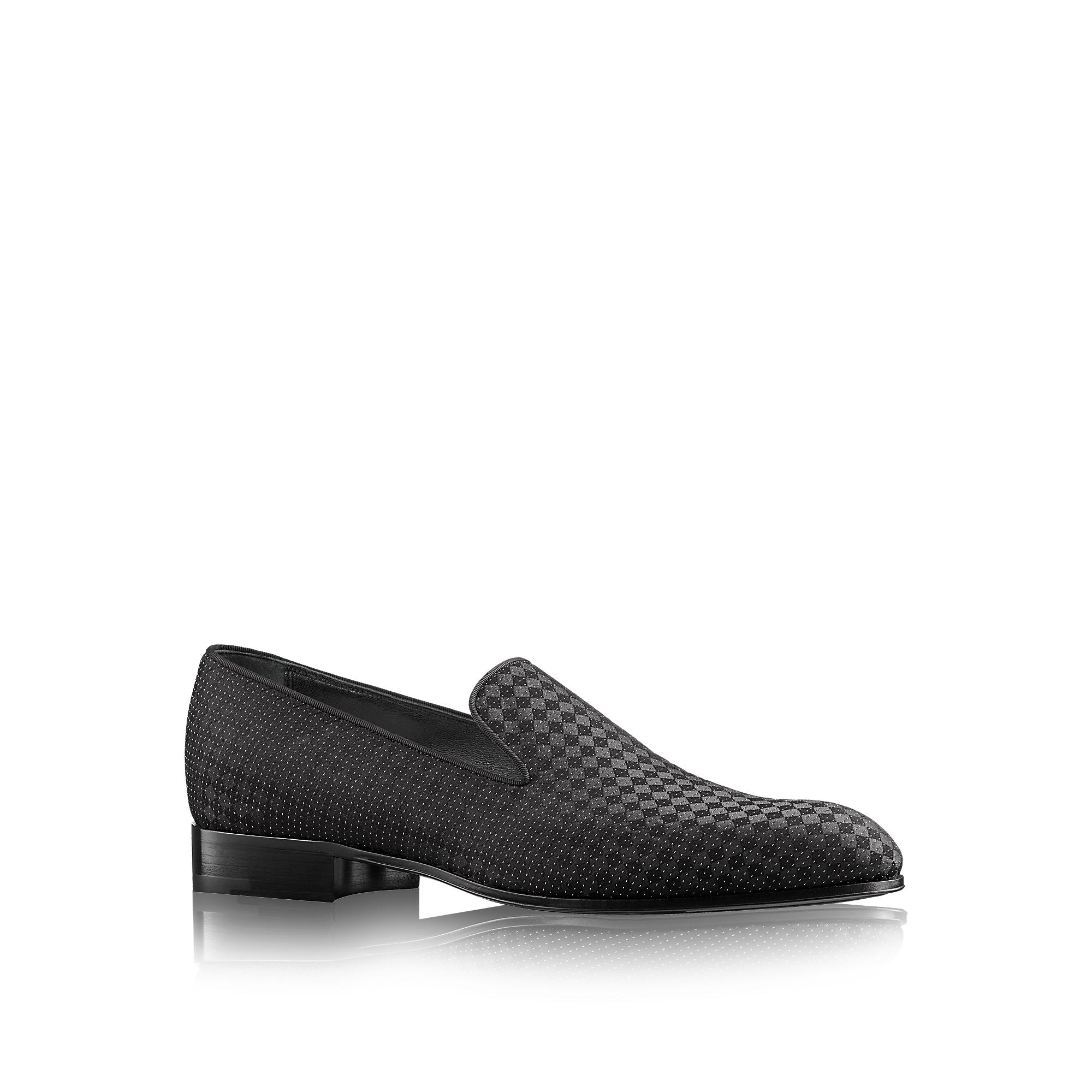 Loafer in Petit Damier silver fabric. Leather hand-painted outsole.