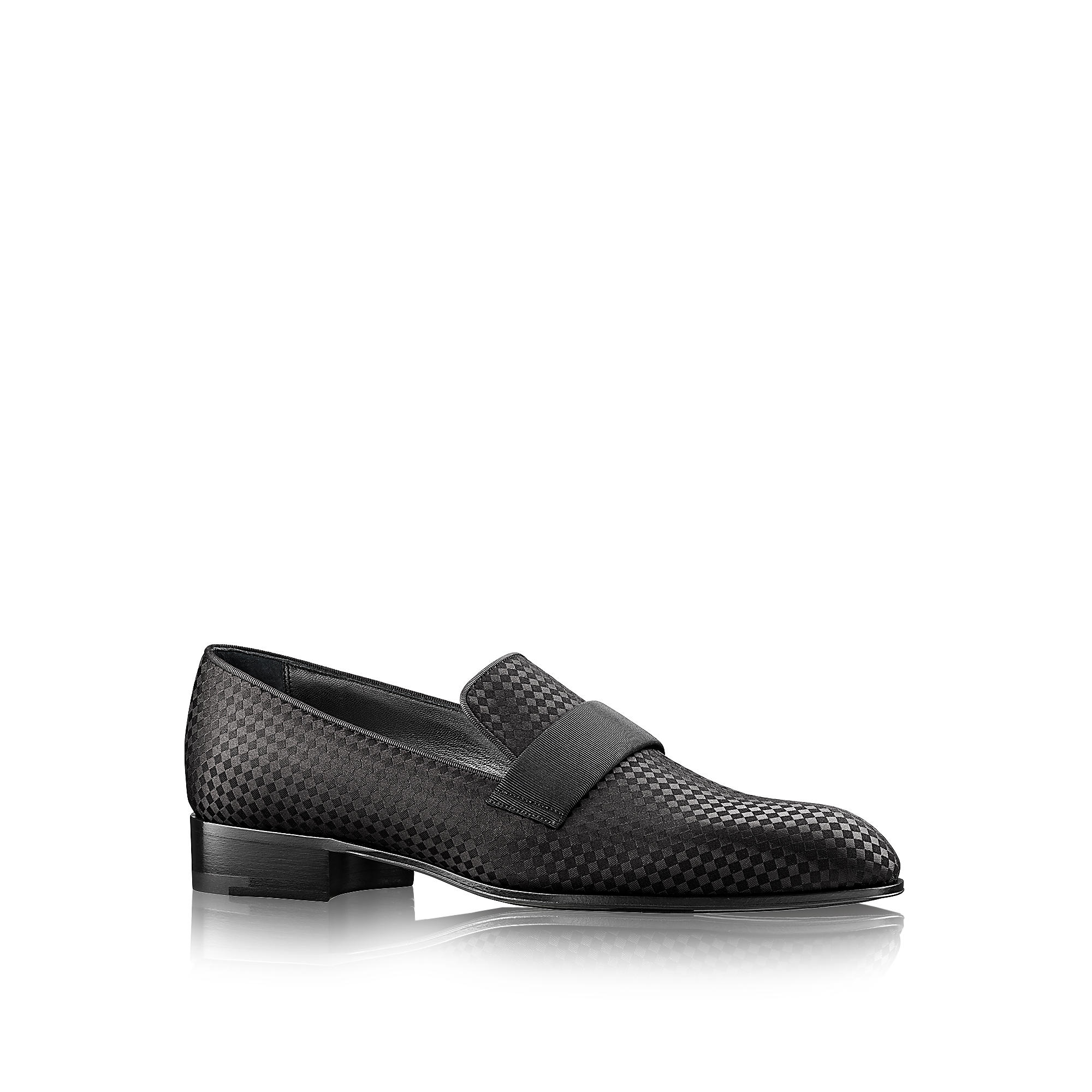A refined and elegant choice for evening, this sleek loafer in Louis Vuitton’s iconic Petit Damier fabric is finished with grosgrain ribbon trim.