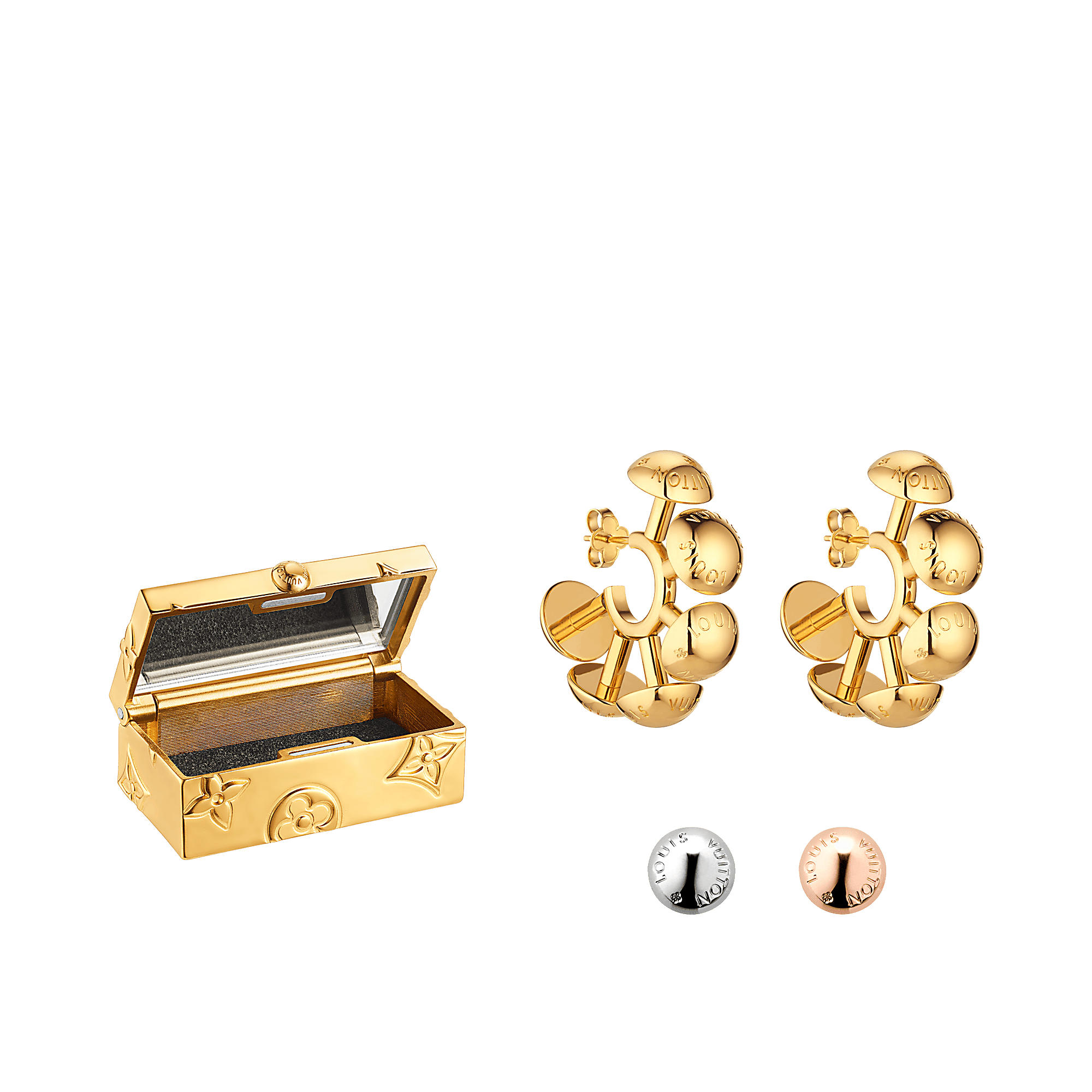 Inspired by the iconic studs from Louis Vuitton’s trunks, these must-have earrings are a twisted classic. Tinted with a tribal touch, they can be customised with replacement palladium and pink gold studs for a graphic bigalva look.