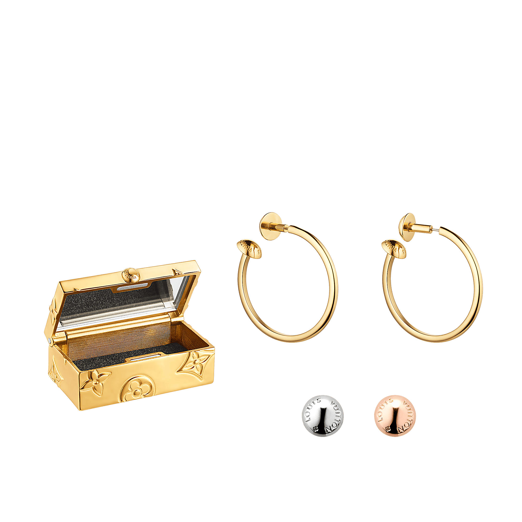 Inspired by the iconic studs from Louis Vuitton’s trunks, these must-have hoop earrings are a twisted classic. They can be customised with replacement palladium and pink gold studs to form a variety of unique combinations.
